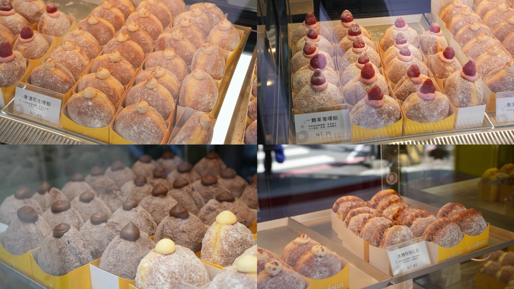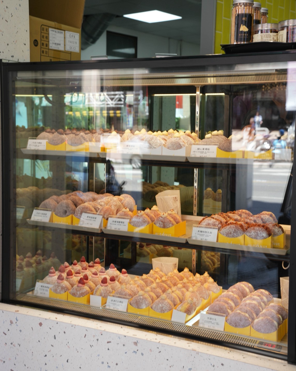 一整櫃滿滿的生甜甜圈真的太療癒了,金黃色的紙托整齊排好,每一顆都圓滾滾的,看起來就好欠吃,不小心就會選擇障礙