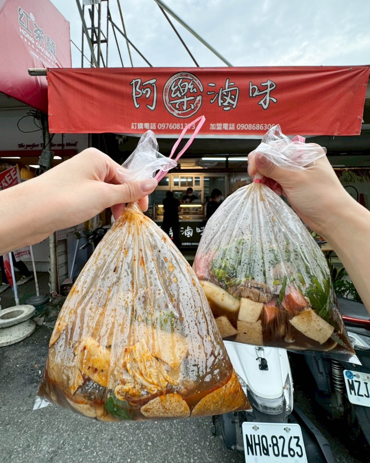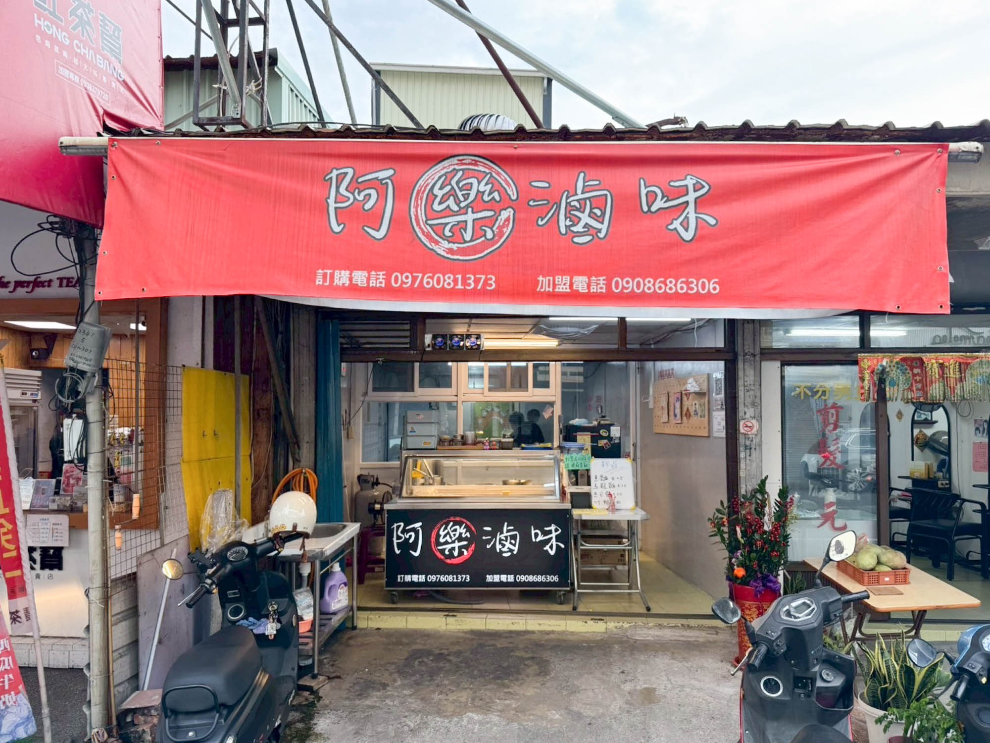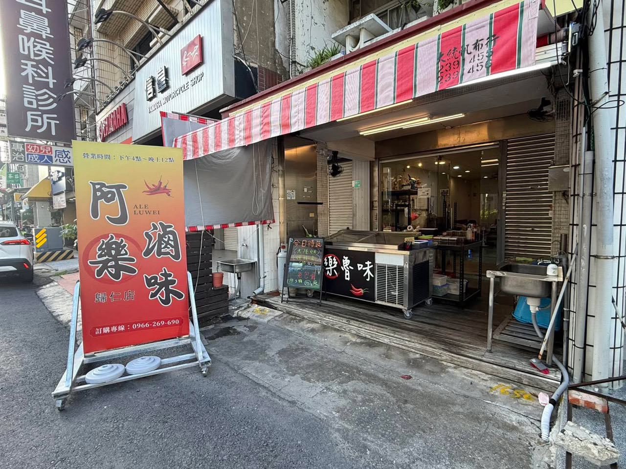 「阿樂滷味」紅色的布條招牌在街邊相當醒目,滷味檯整齊地擺放在店門中央,讓人一眼就能看到豐富的配料