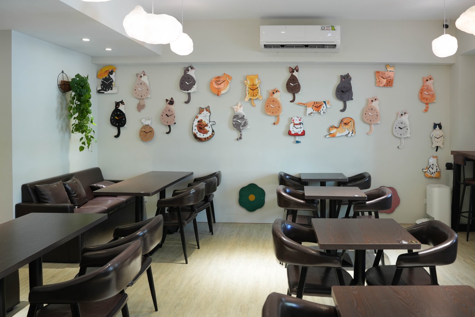 「都在漫食間」的室內空間,整體氛圍溫馨又療癒,白色牆面上掛滿各式各樣的貓咪造型時鐘,有的在打瞌睡、有的伸懶腰,好想帶回家收藏!深色木質桌椅搭配柔軟的沙發座位,給人一種放鬆又舒服的感覺~