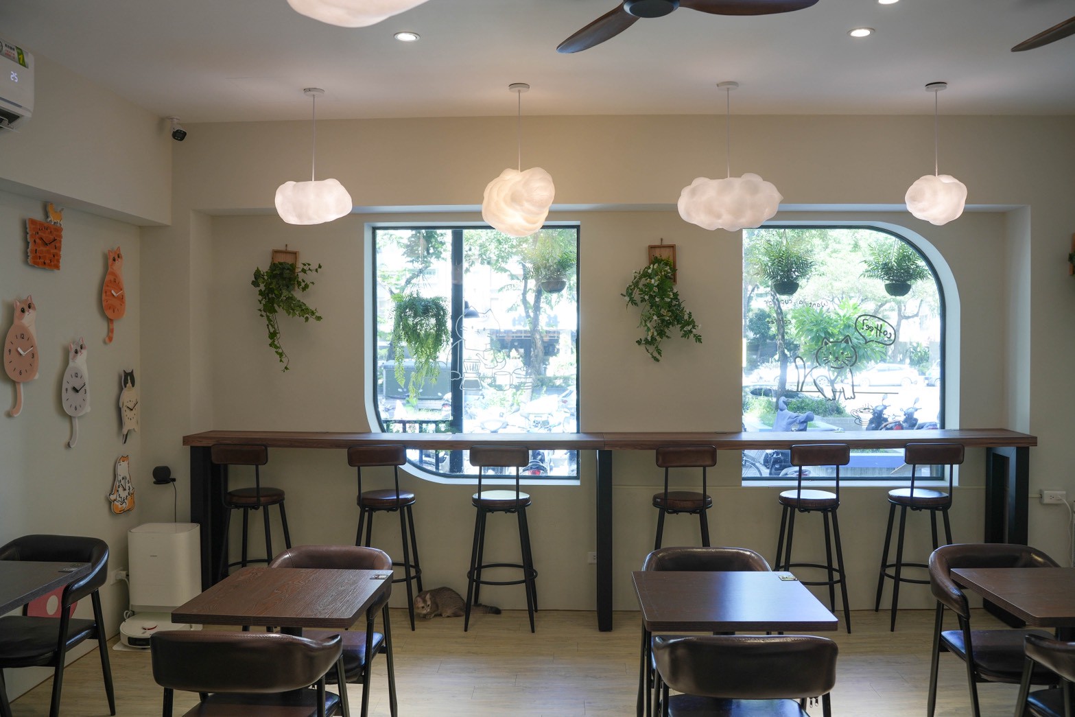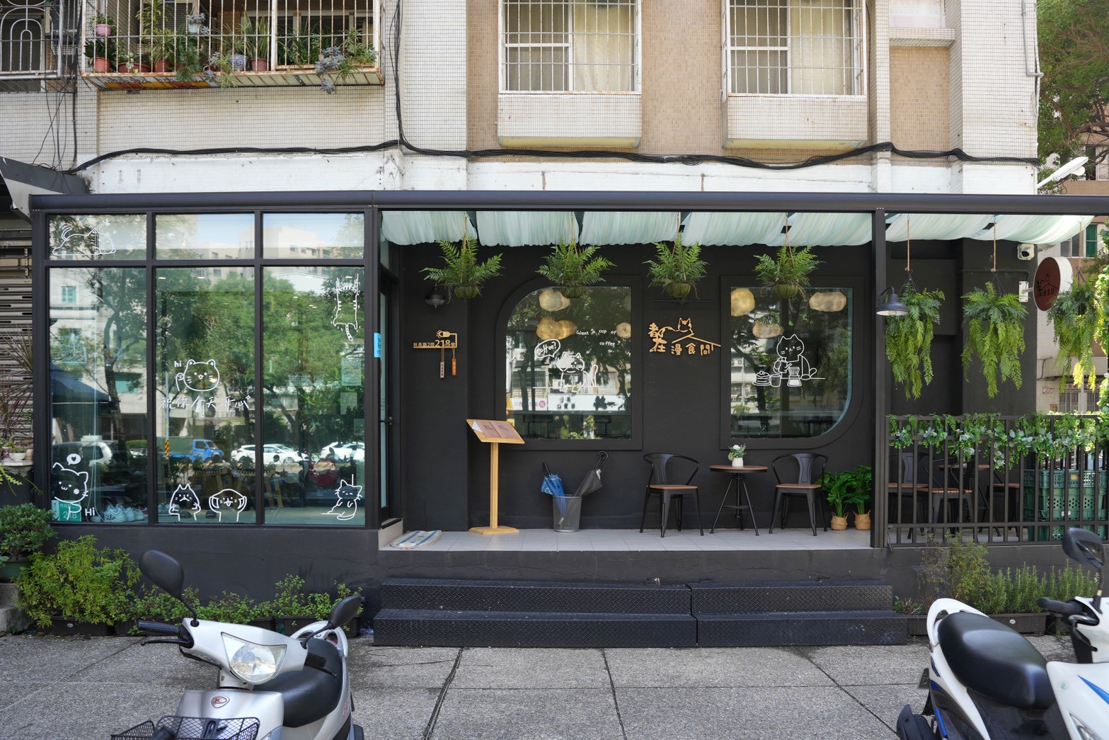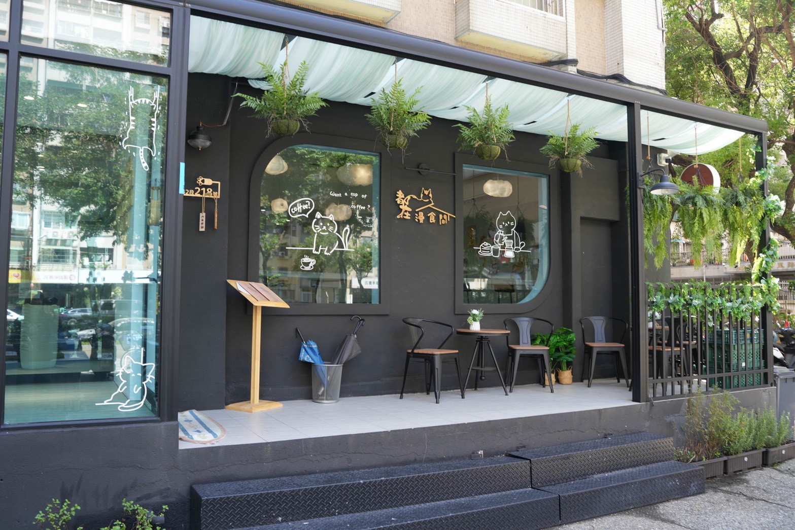 深色系設計配上滿滿的綠植,門口還有可愛的貓咪玻璃貼圖,很可愛,外面的小桌椅區也很有歐風咖啡館的氛圍