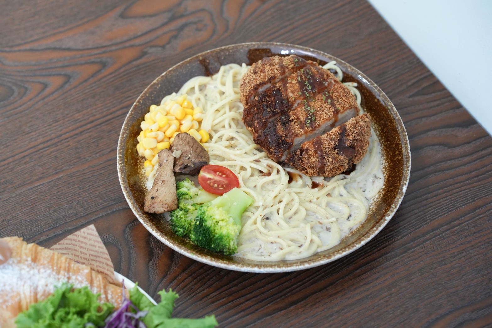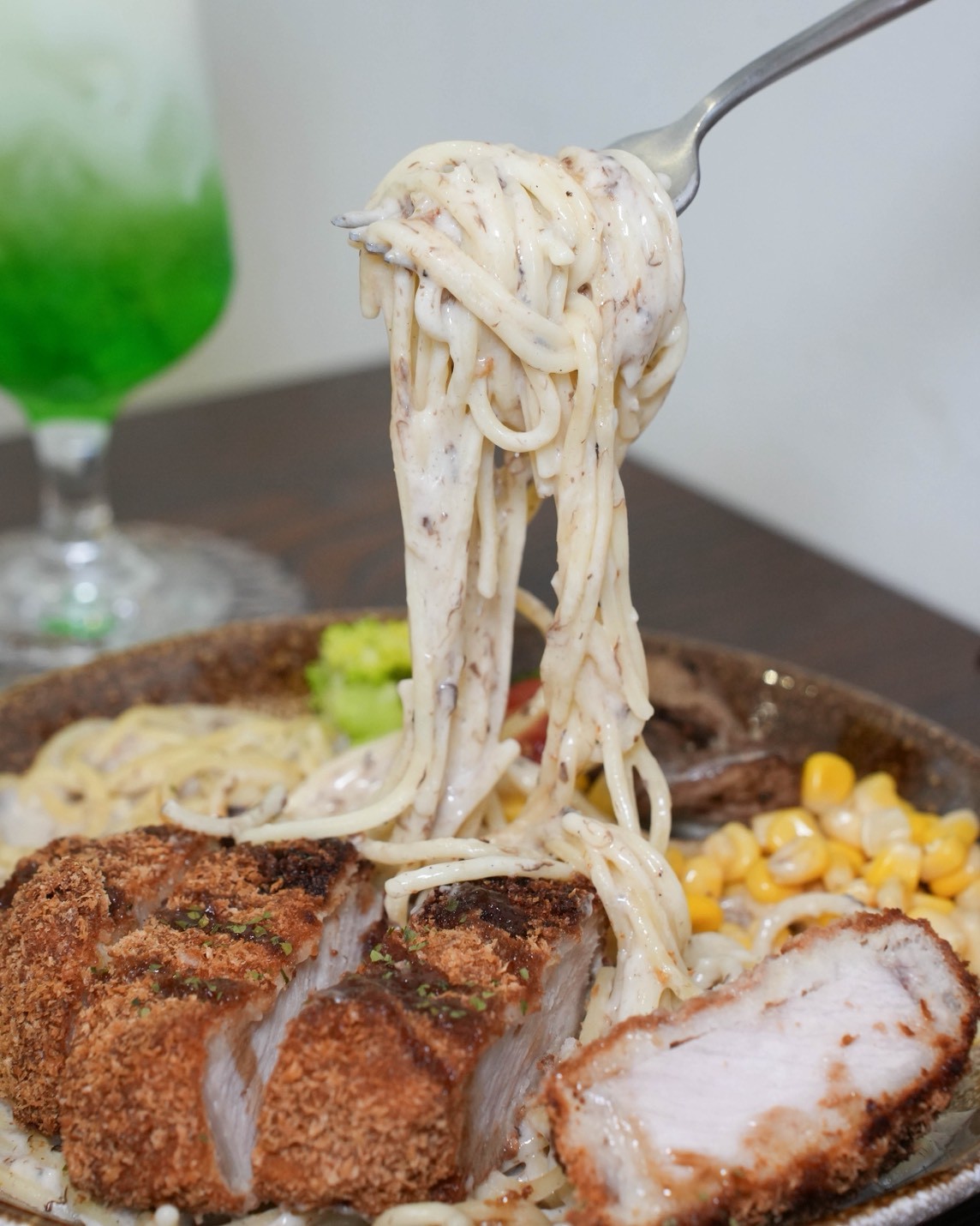 這道完全是罪惡代表!厚切豬排炸得金黃香脆,義大利麵搭配濃郁的奶油松露醬,每一口都充滿香氣,麵條收汁剛好,濃郁但不膩口
