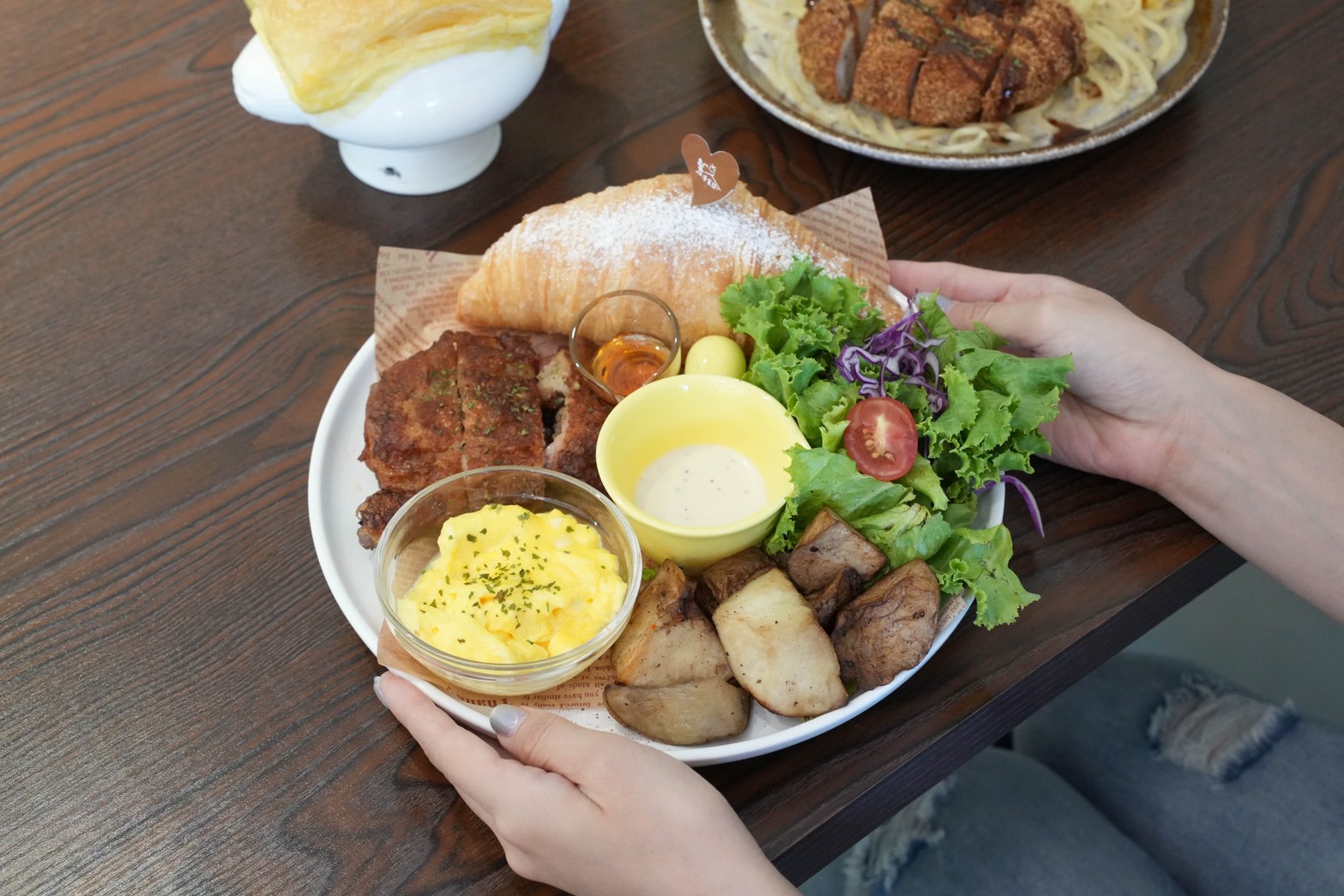 雞腿排外皮煎得微酥,咬起來肉質香嫩多汁,一旁有馬鈴薯塊、可頌麵包、生菜沙拉、炒蛋,十分豐富