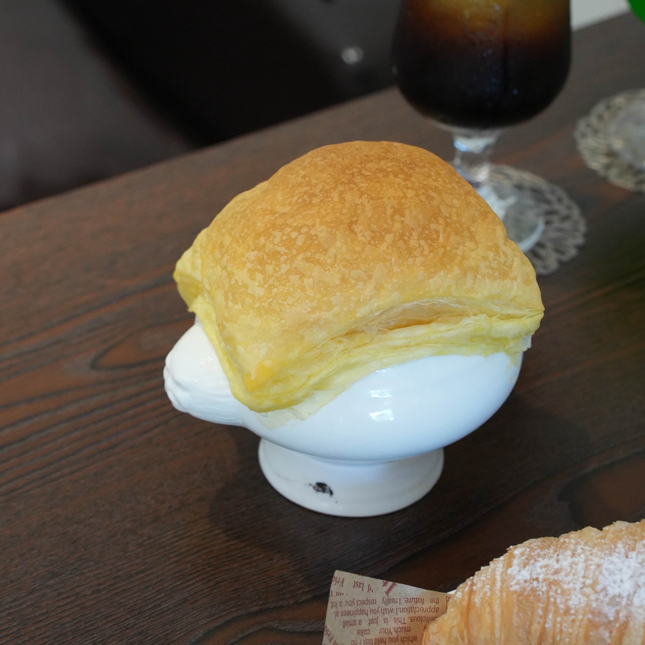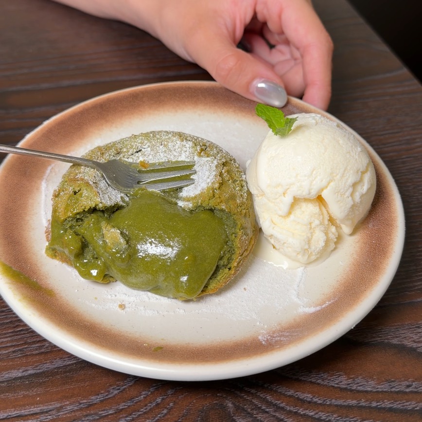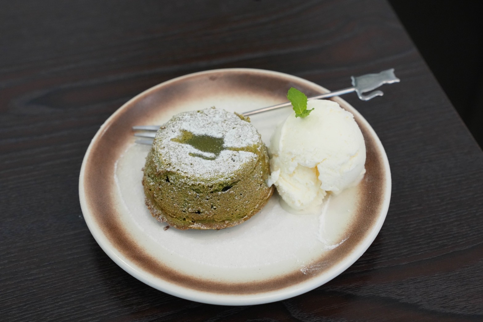 壓軸甜點一定要留肚子給它!外層微酥、裡面是會流心的濃郁抹茶餡,一切開就融出來~搭配冰淇淋一起吃,蠻不錯