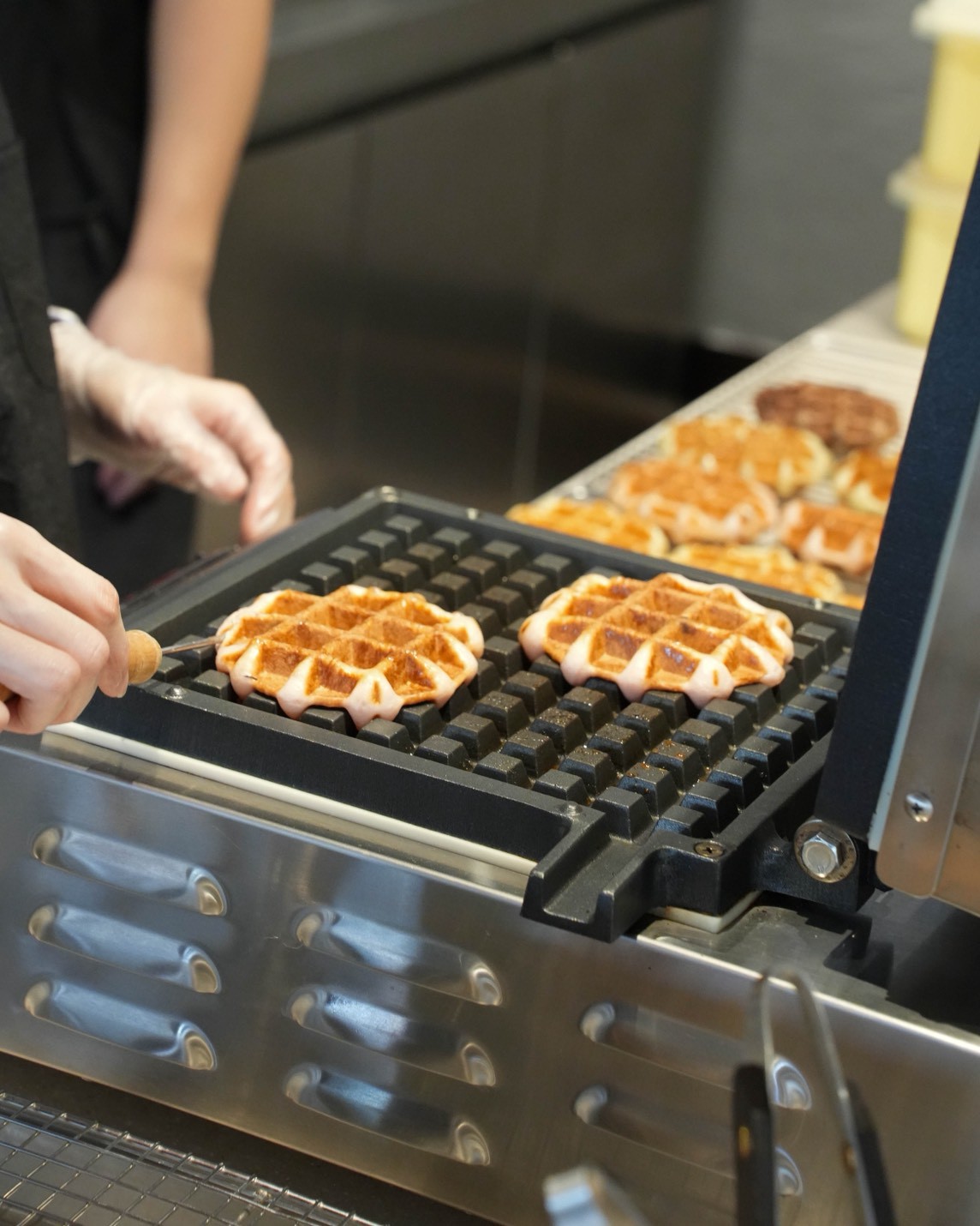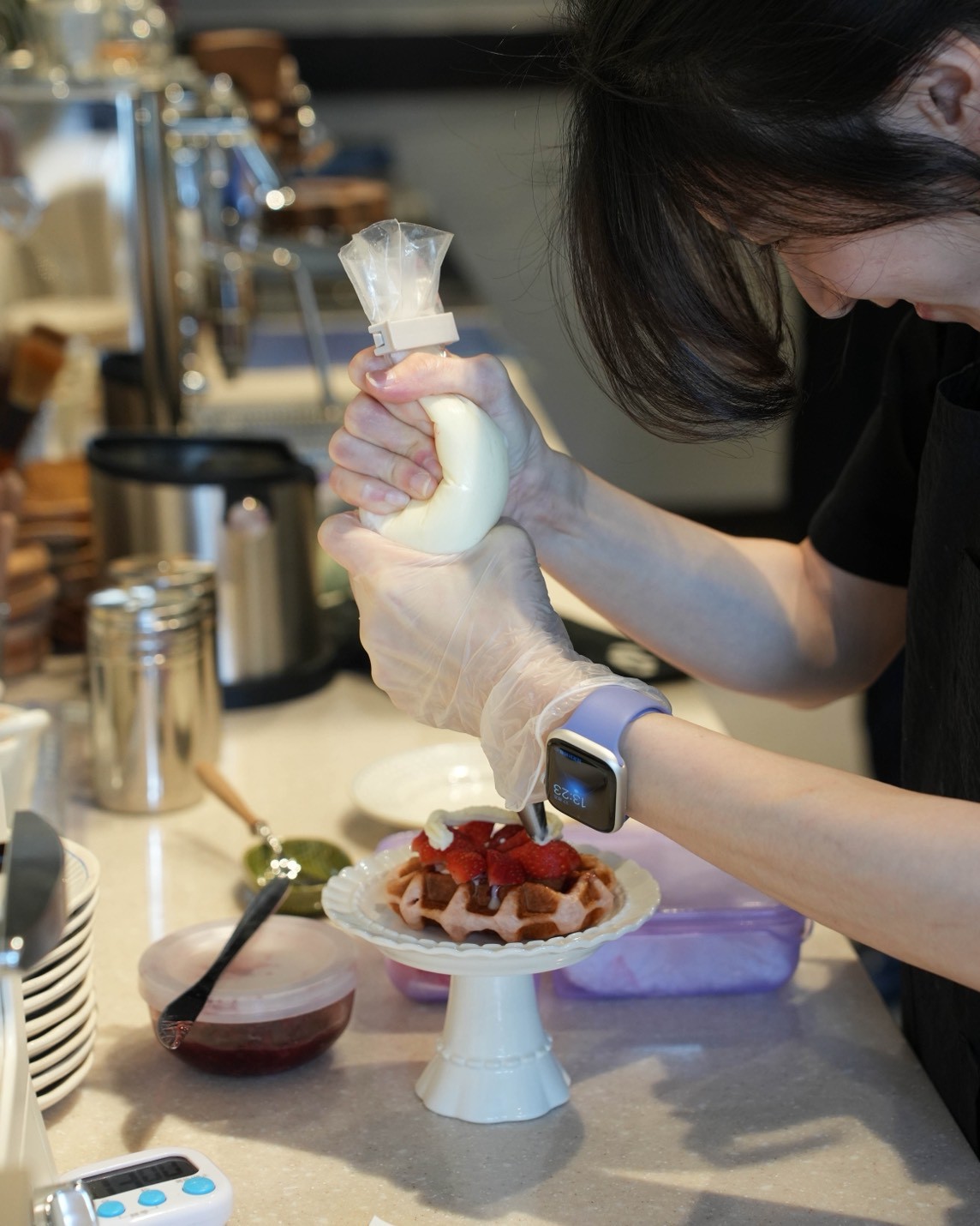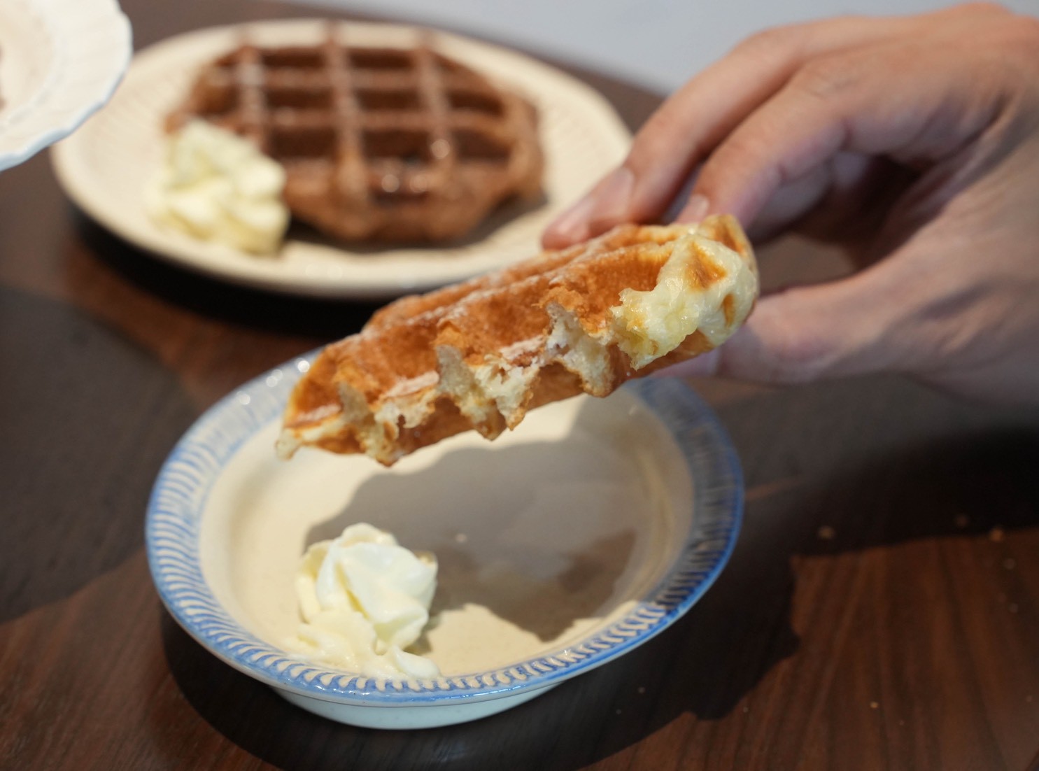 另一邊,老闆娘也正在烤鬆餅,手揉麵糰放入機器中,空氣中慢慢飄出奶油與麵香交織的香氣!