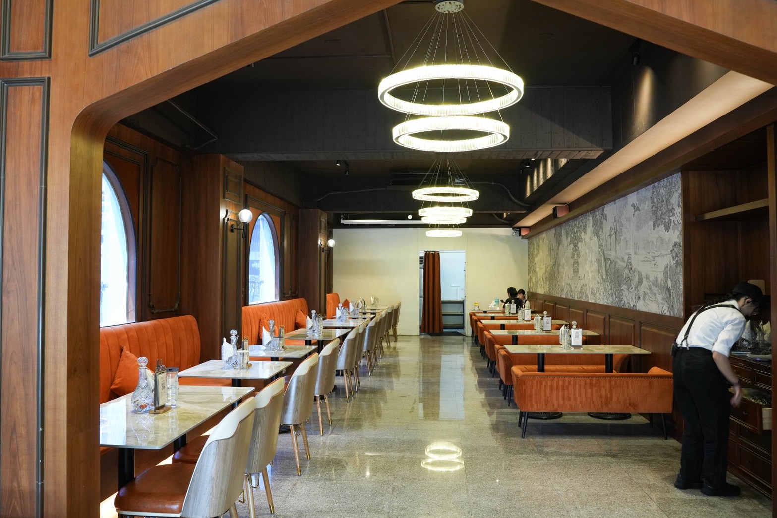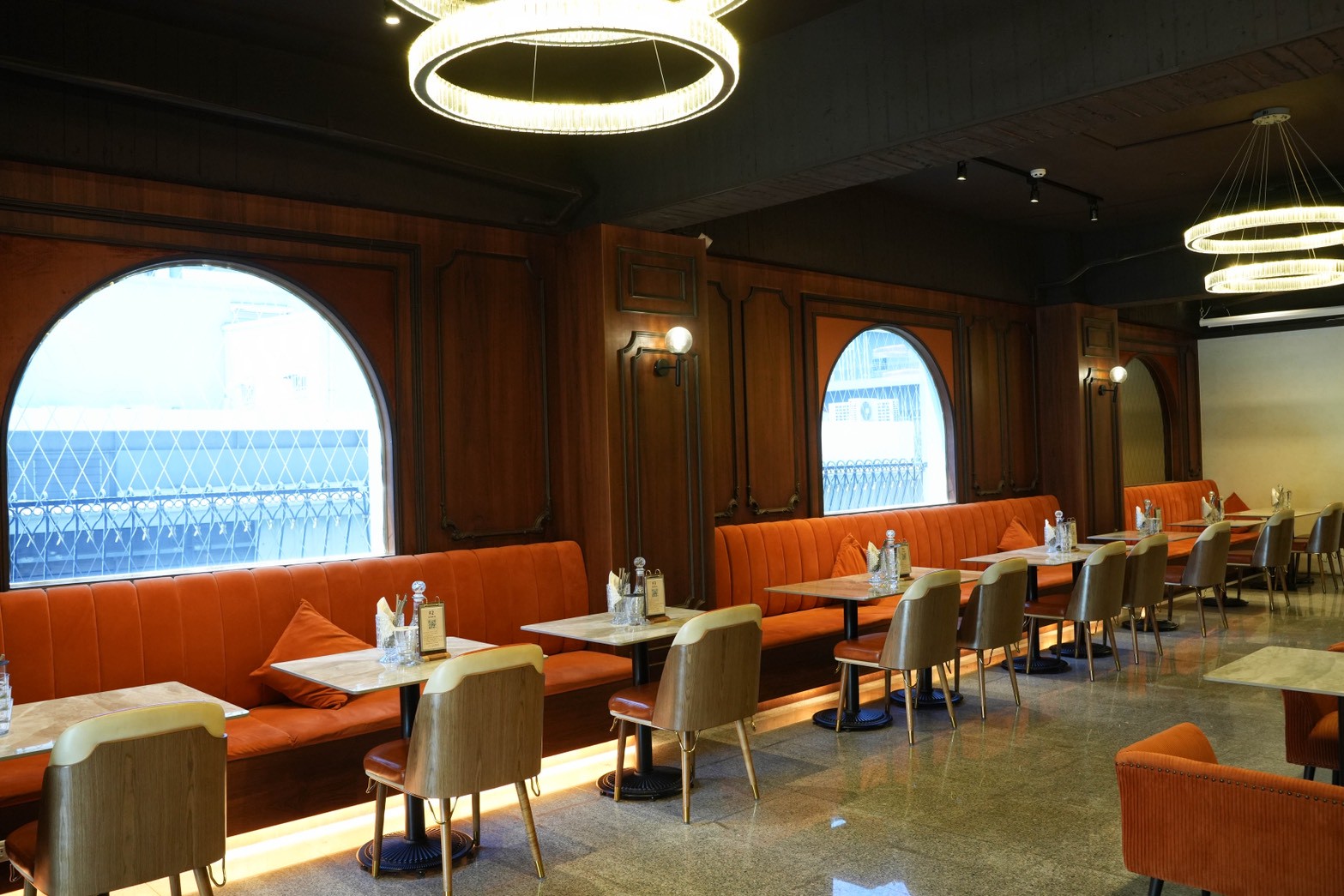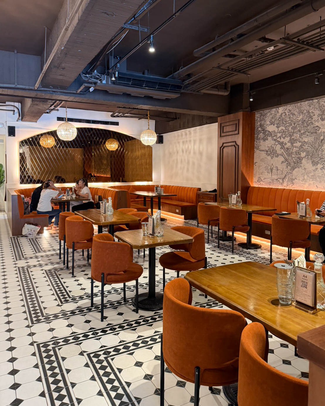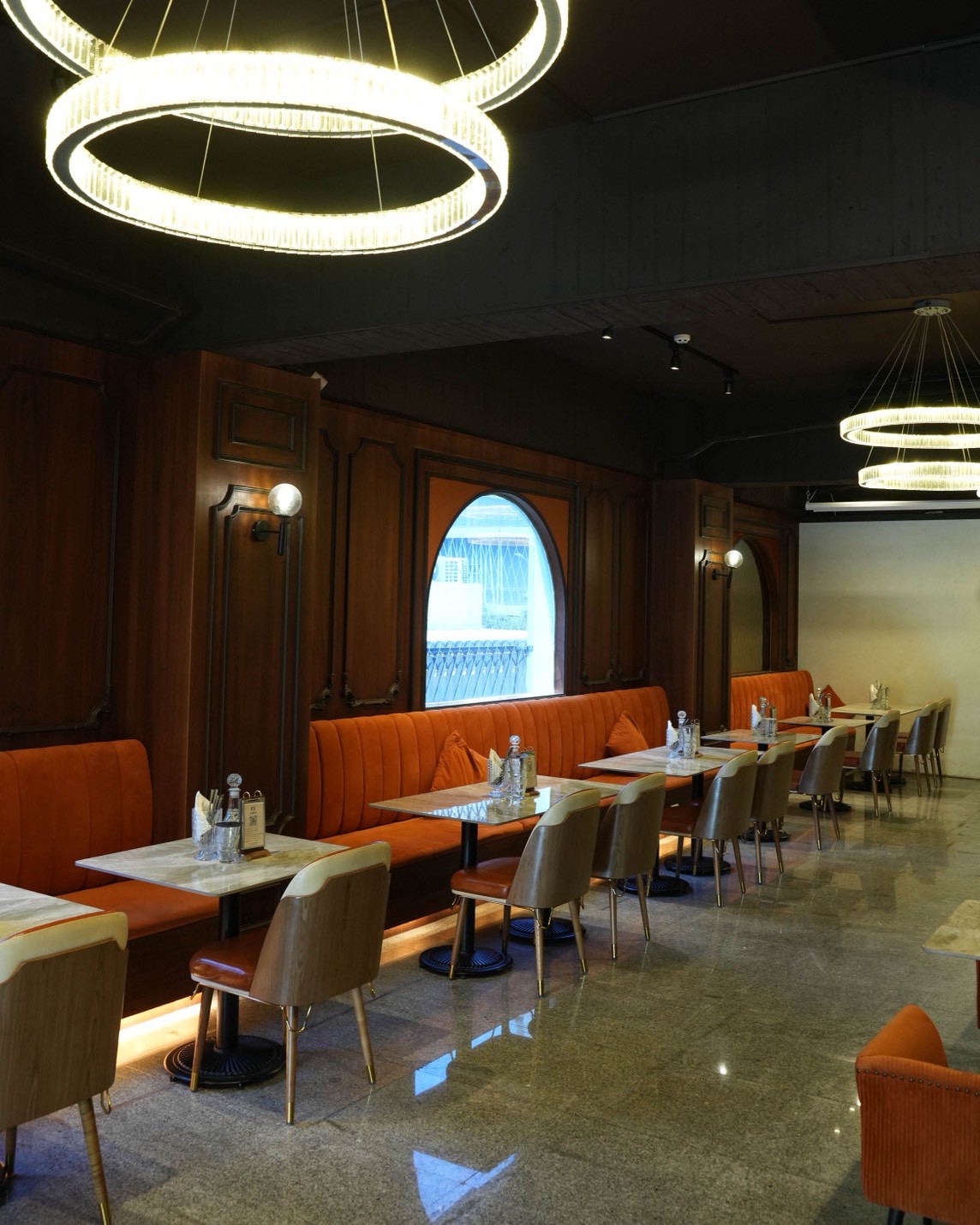 橘色絨布長椅,讓人一坐下就覺得放鬆,牆面是深色木質調,加上圓弧形的復古窗,好像走進了歐洲老派餐廳。天花板上還掛著環狀水晶吊燈,多了一點奢華復古的氛圍~