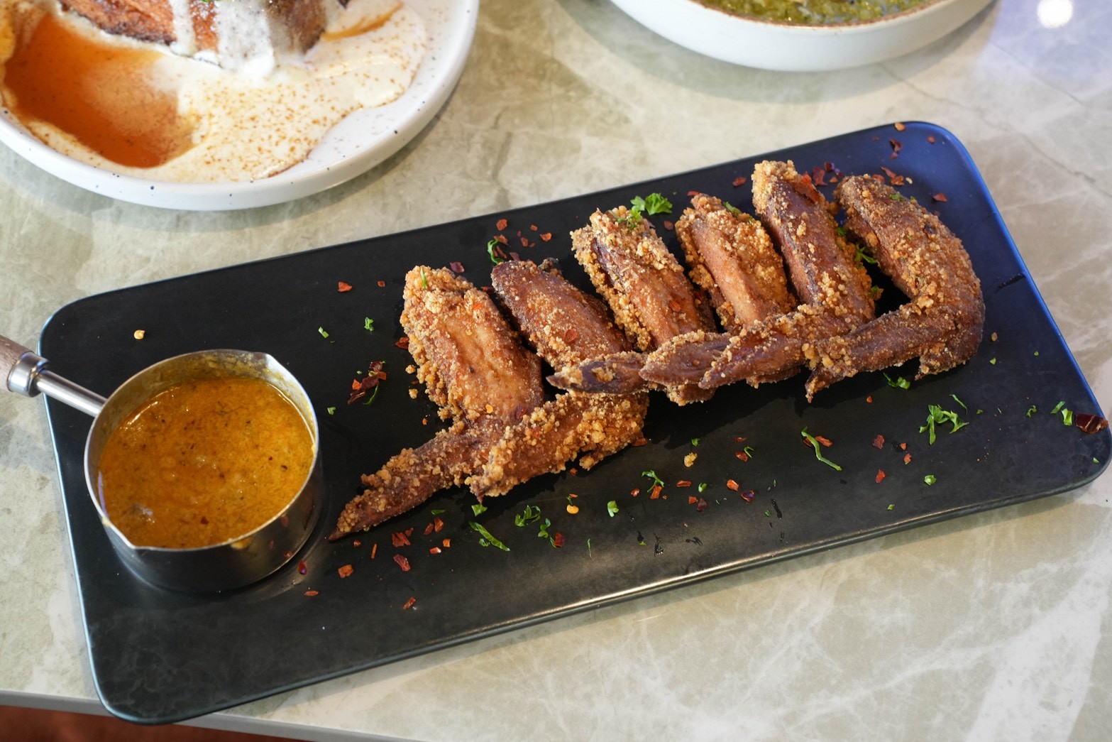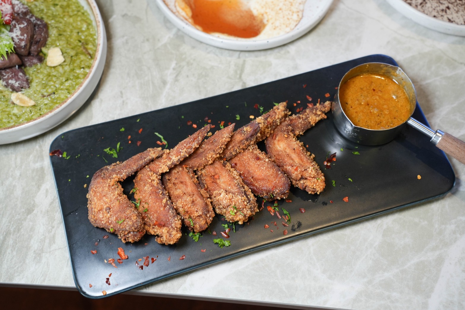 金黃酥脆的炸雞翅淋上店家自製的火山奶油醬,吃起來外酥內嫩,口感微辣涮嘴,一不小心就整盤清空!