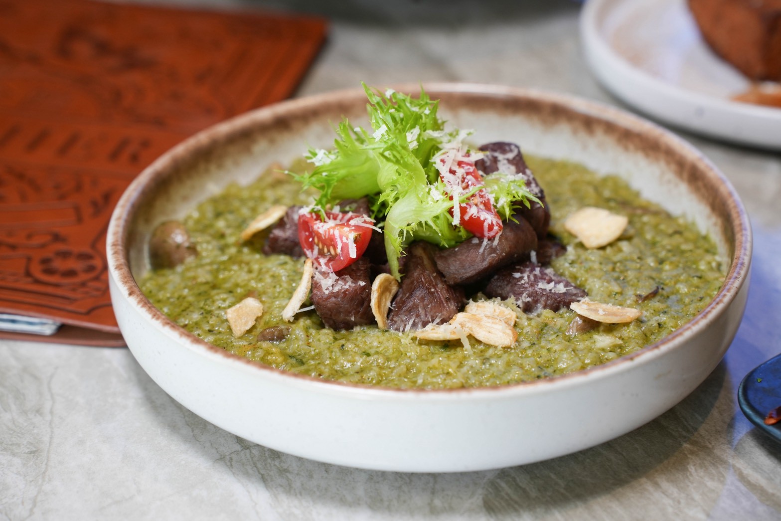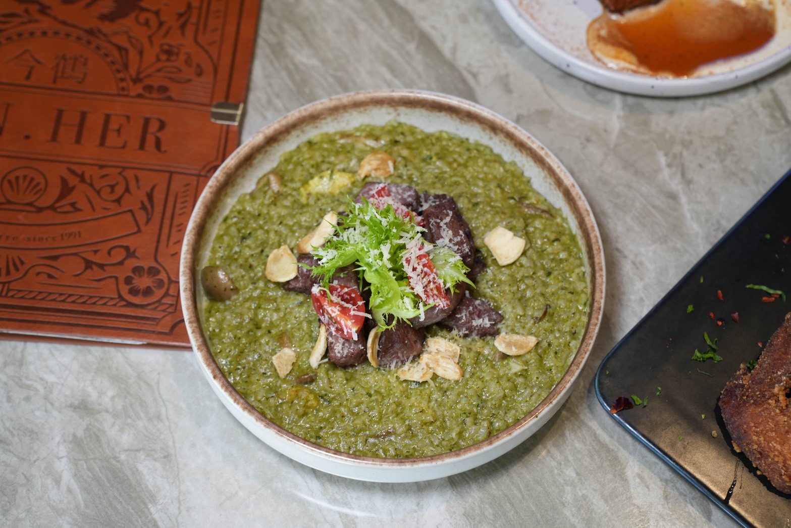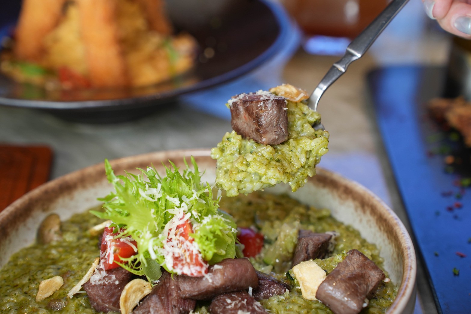 這道算是今晚的心頭好!燉飯吸飽菠菜青醬的香氣,綠油油的看起來很療癒。骰子牛烤到外層微焦,裡面卻還保有嫩度,跟燉飯一起入口超滿足。