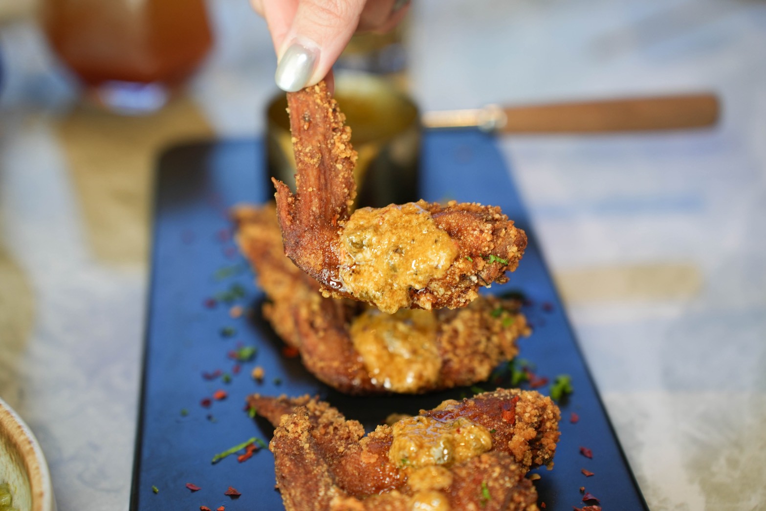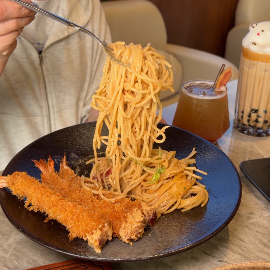 義大利麵是帶點辣度的麻奶風味,辣得很溫潤不嗆口,麻香氣十足吃起來很涮嘴~ 炸蝦外皮酥脆,裡頭的蝦肉新鮮彈牙,蝦控不要錯過