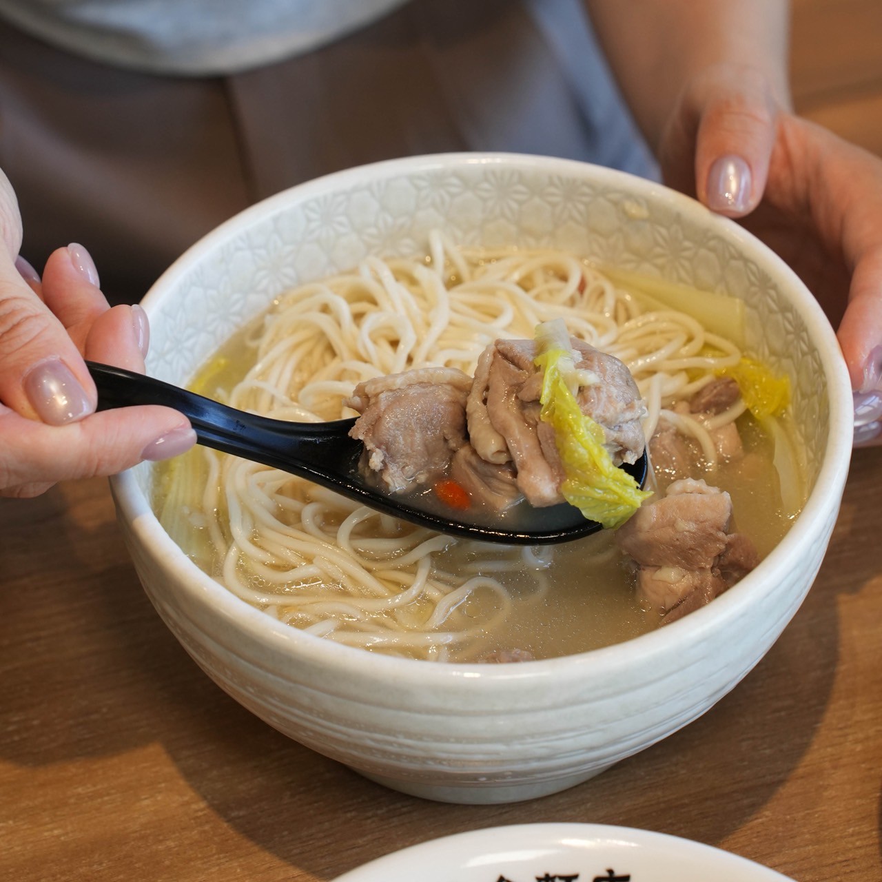新推出的濃厚蒜頭雞湯麵絕對是溫補系的朋友最愛,雞湯以蒜頭慢火熬煮,香而不嗆,湯頭喝起來溫潤順口,選用去骨黑羽土雞腿肉,雞肉吃起來香嫩多汁,麵條Q彈吸收了湯汁,讓人一口接一口!