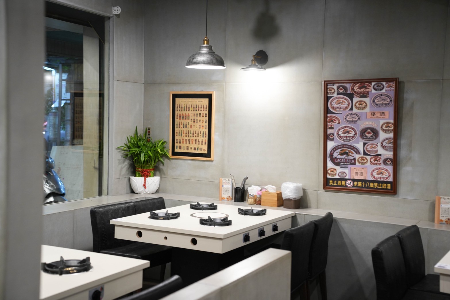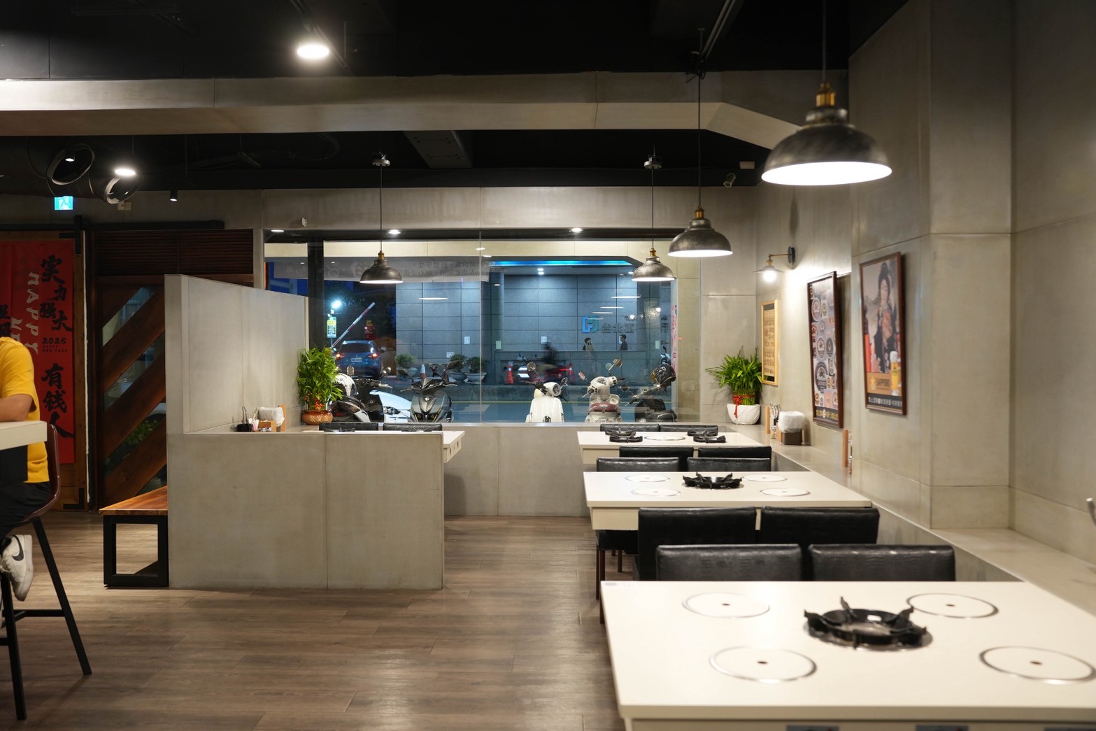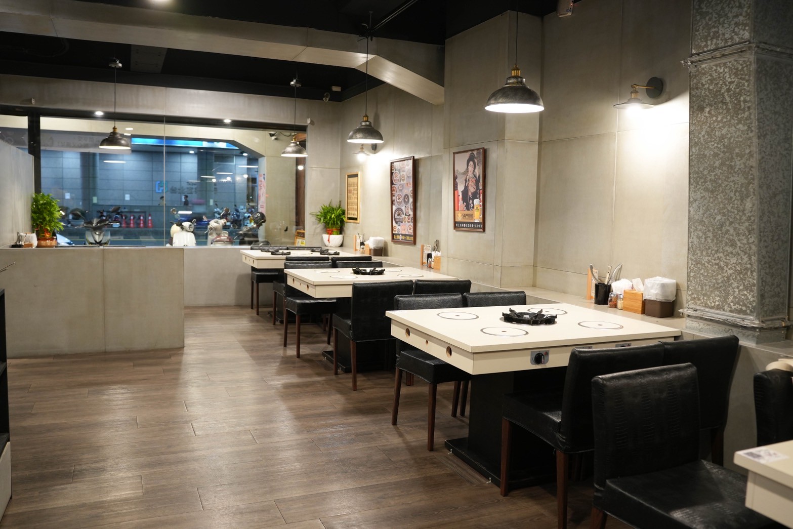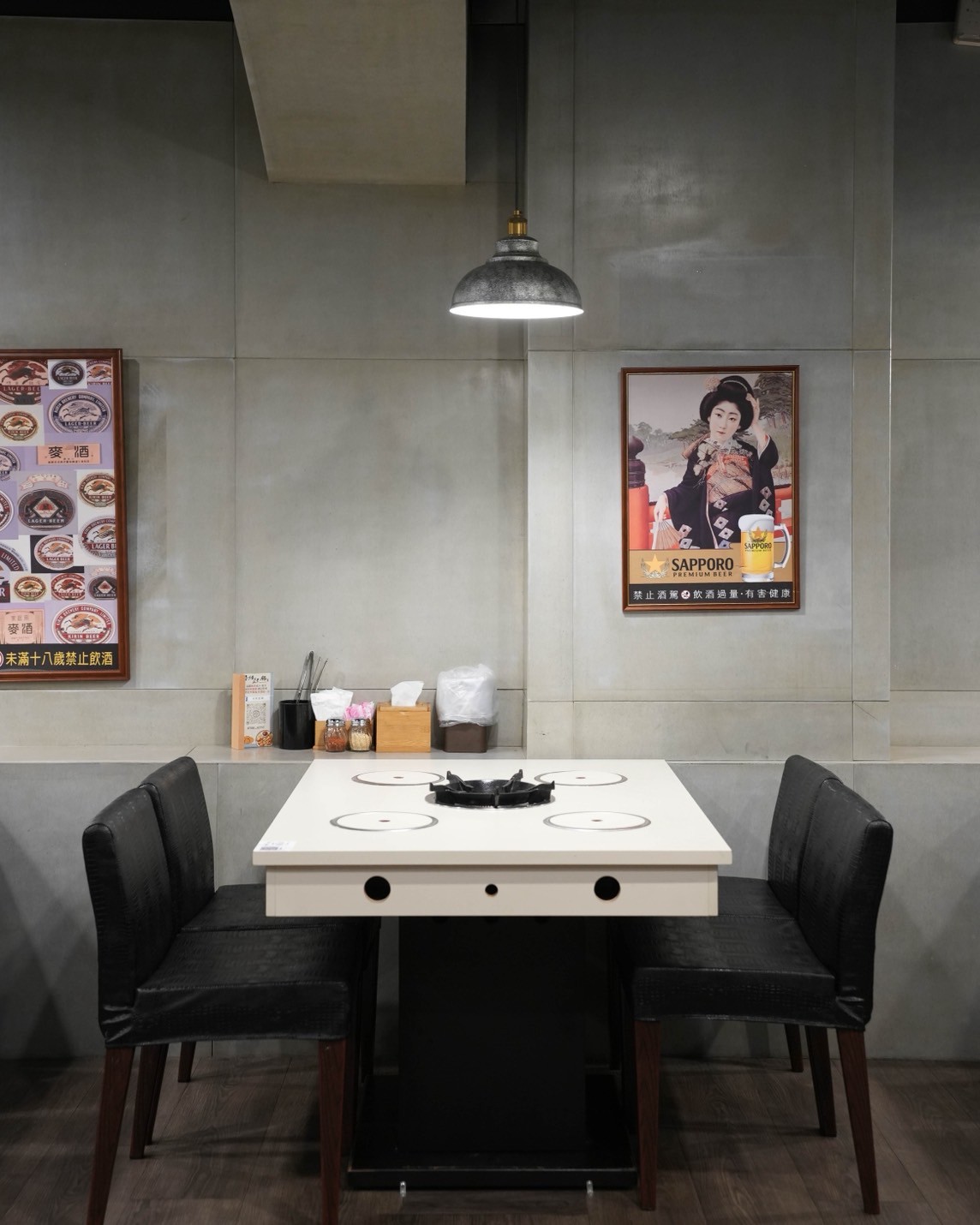 整體空間以簡約的水泥灰色調為主,搭配木質地板與黑色皮椅,整體蠻舒適的,座位安排寬敞,不會擁擠,四人桌、長桌都有,很適合聚餐