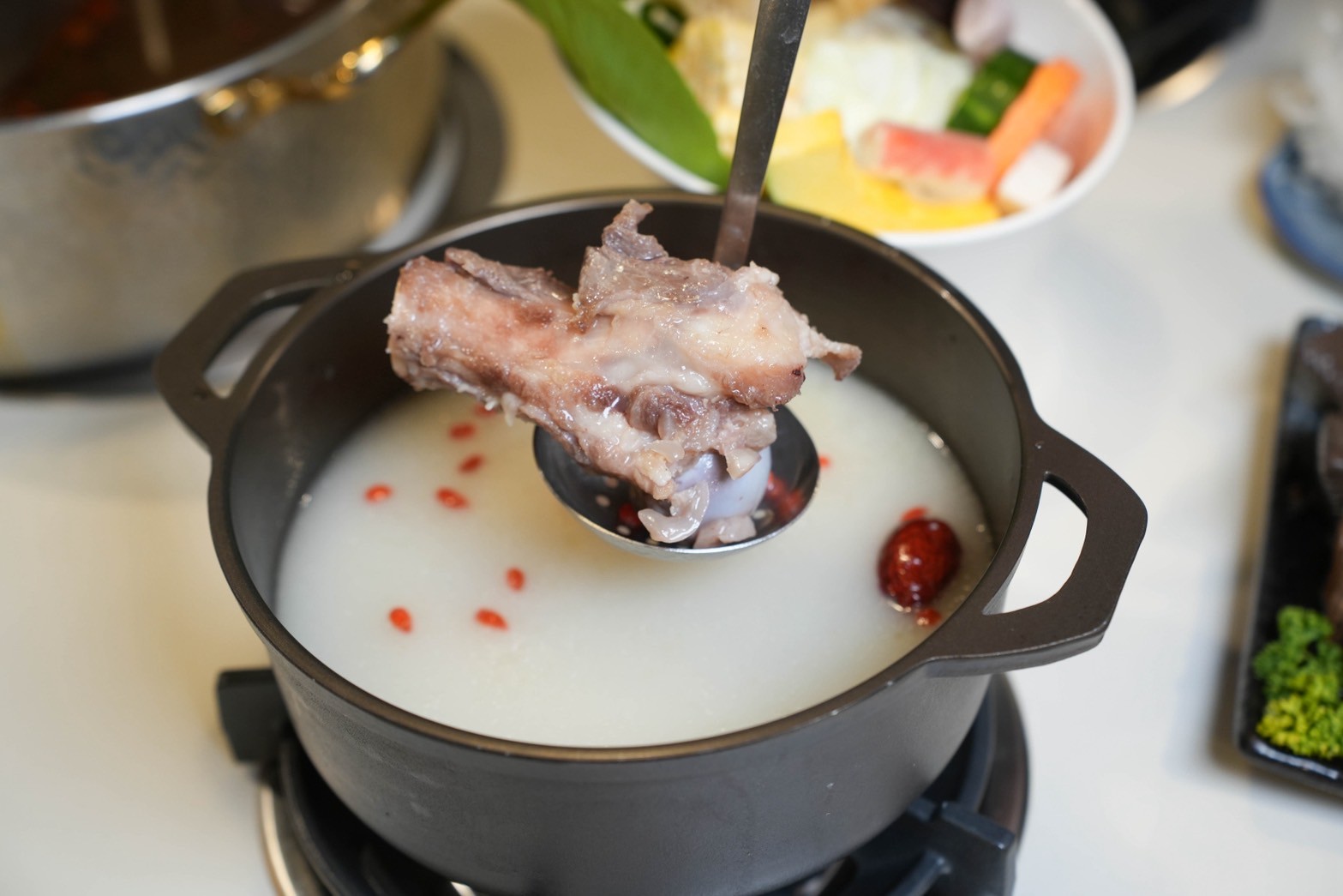 雪白豚骨鍋:湯頭乳白濃厚,喝起來溫潤順口,裡面還有一隻大骨呢,涮肉或煮青菜都很好吃,很適合平常喜歡清爽口味的火鍋控