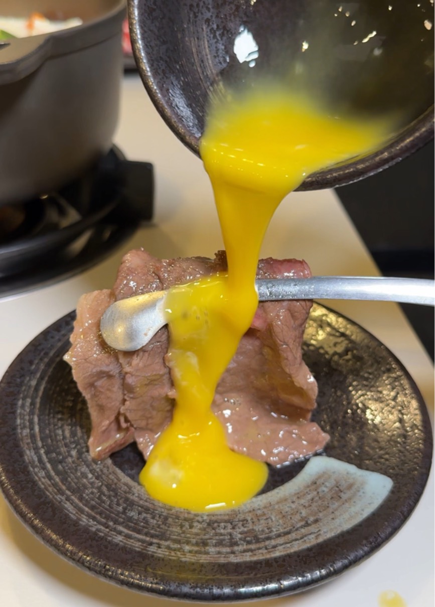 把牛肉涮入壽喜鍋,起鍋後再淋上升蛋黃,吃起來根本是神仙組合