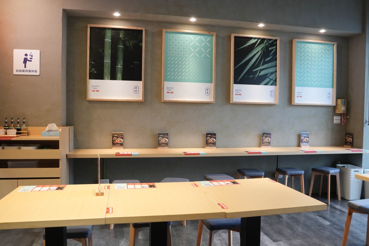 店內是走一種清爽又安靜的日系風格,大片淺木色的桌椅讓空間看起來很明亮,一旁還有自助醬料區,擺放得乾乾淨淨的,整間店給人
