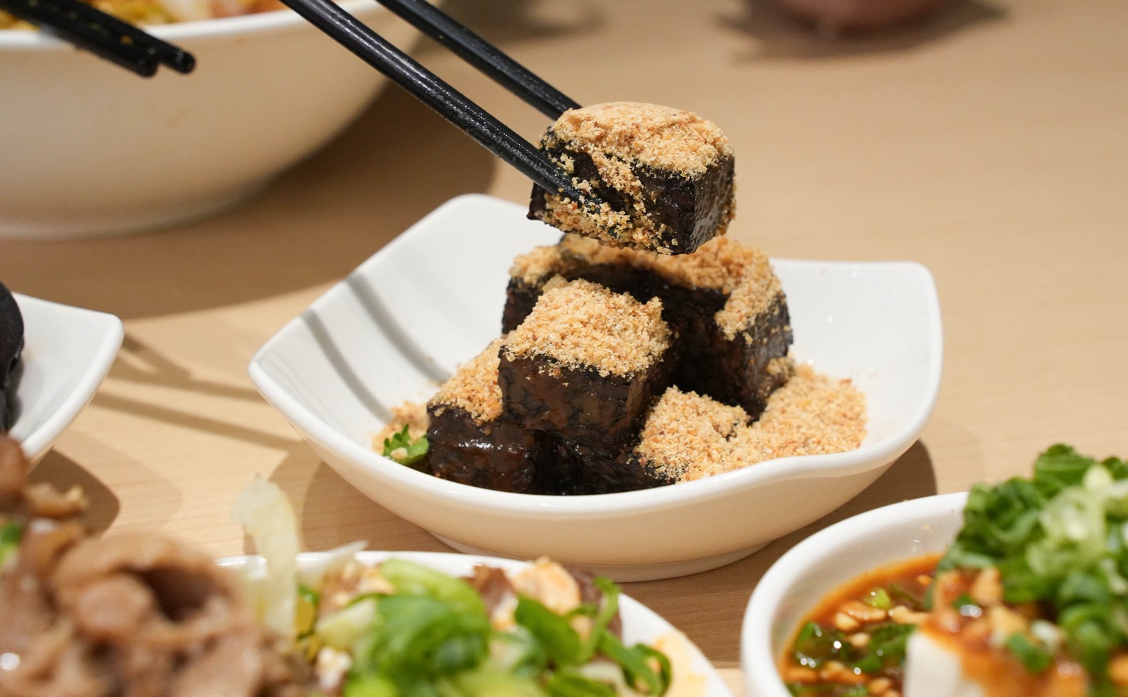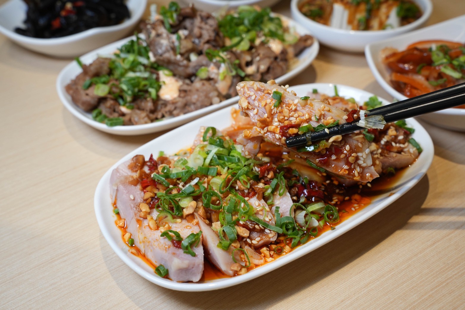 櫃台前的小菜櫃超級吸睛,整排白色小碟排得乾乾淨淨。涼拌豬耳、五香豆干、醋溜木耳、韓國泡菜通通都有,真的是讓我選擇障礙欸,每一種都想吃!