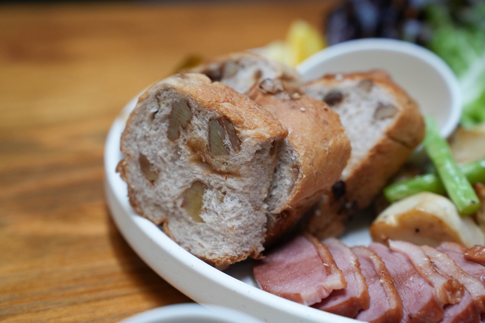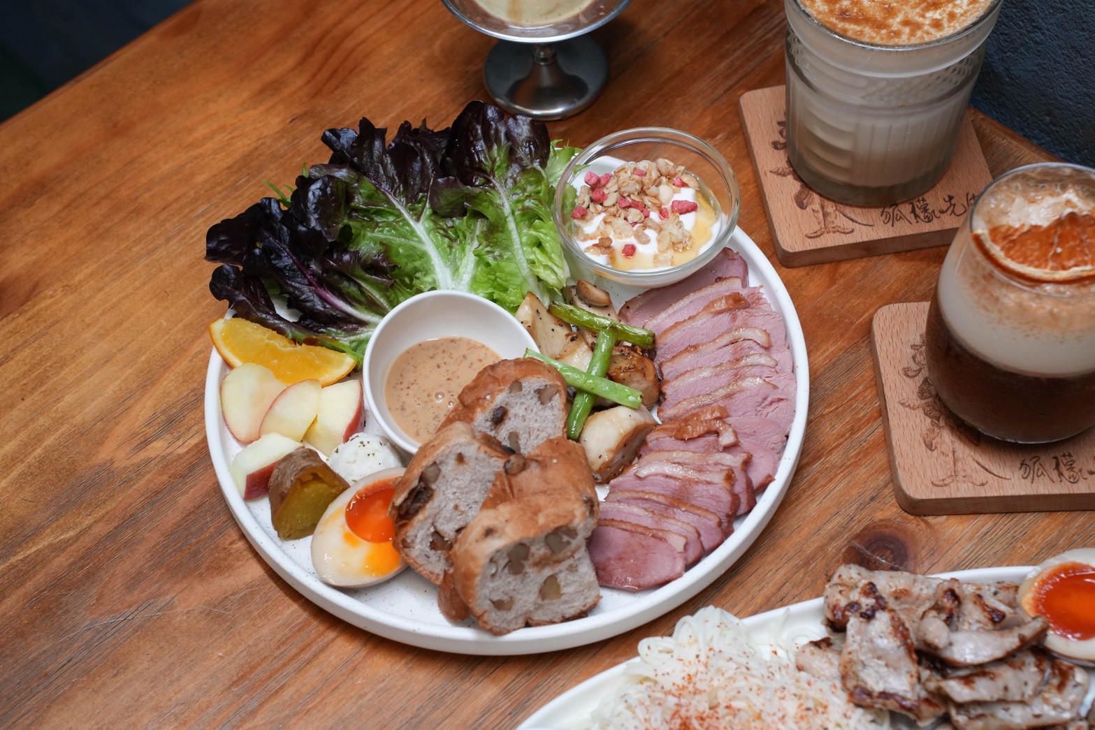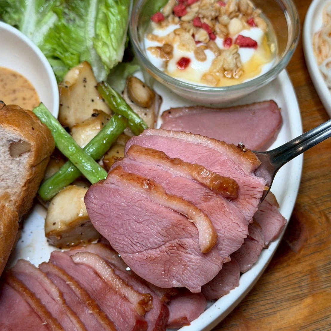 這道份量真的很有誠意,煙燻鴨胸給得很大方,口感軟嫩不乾柴,鴨胸控可以放心點,搭配麵包、生菜、水果等,整體吃起來很有飽足感,對食量大的人很加分
