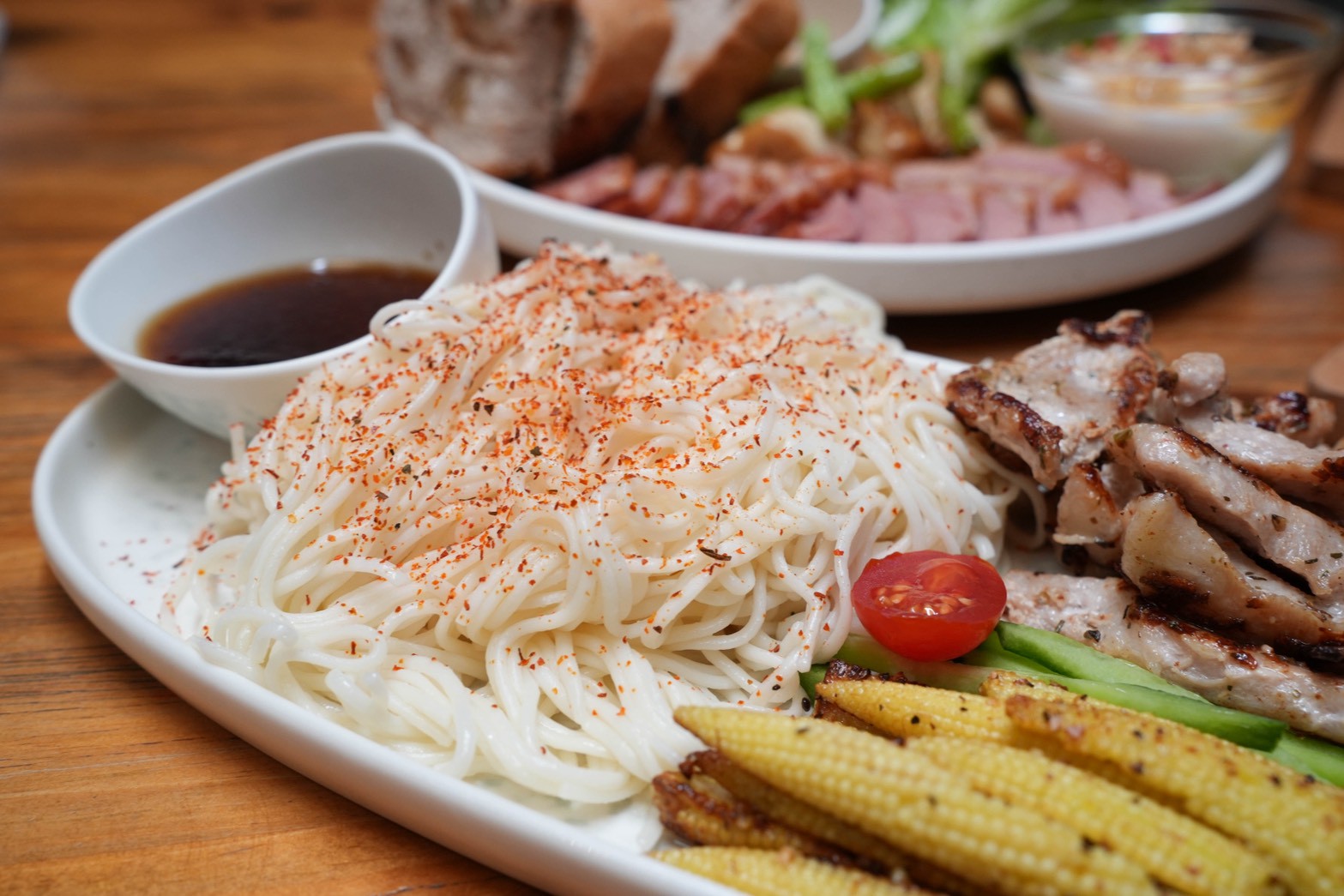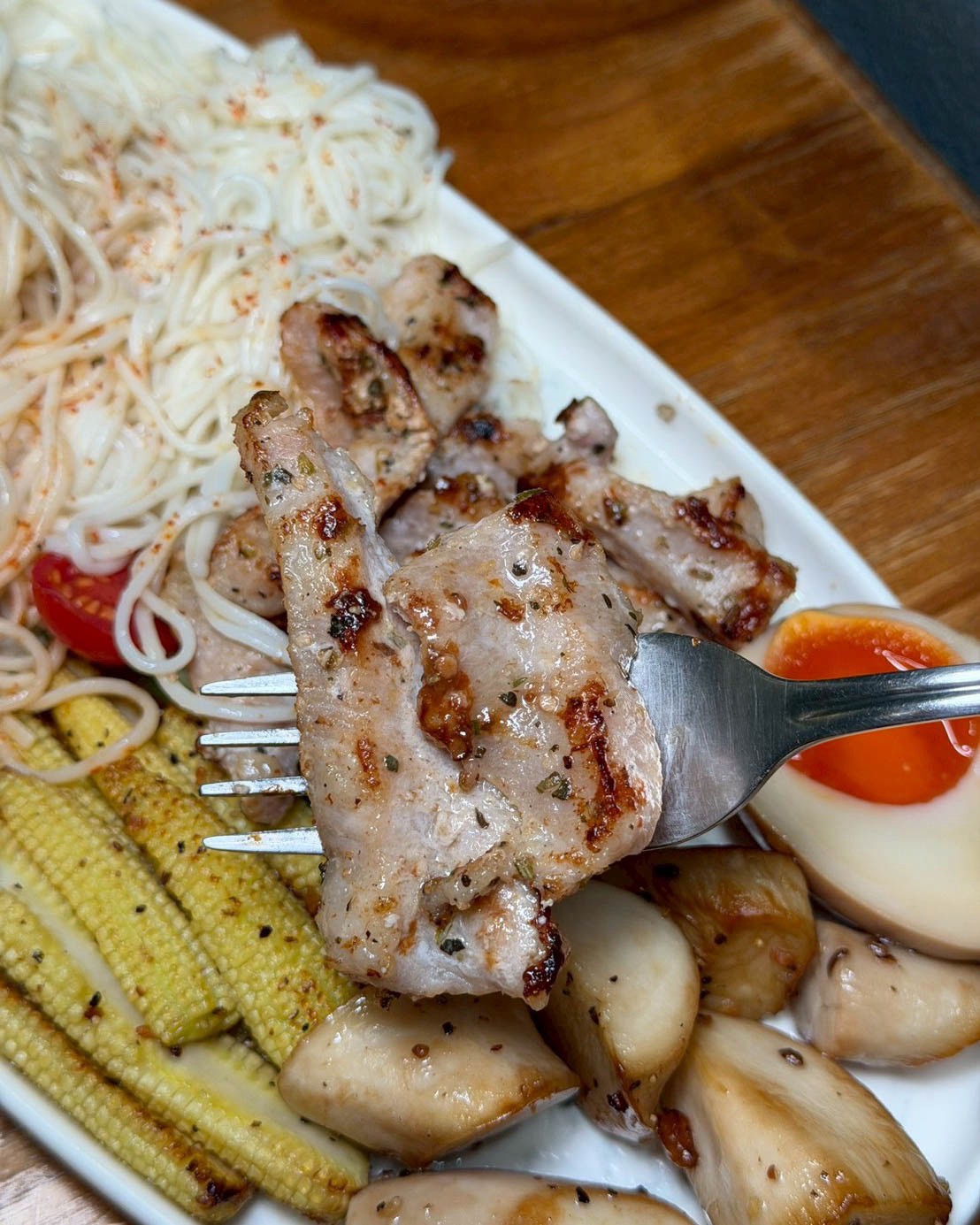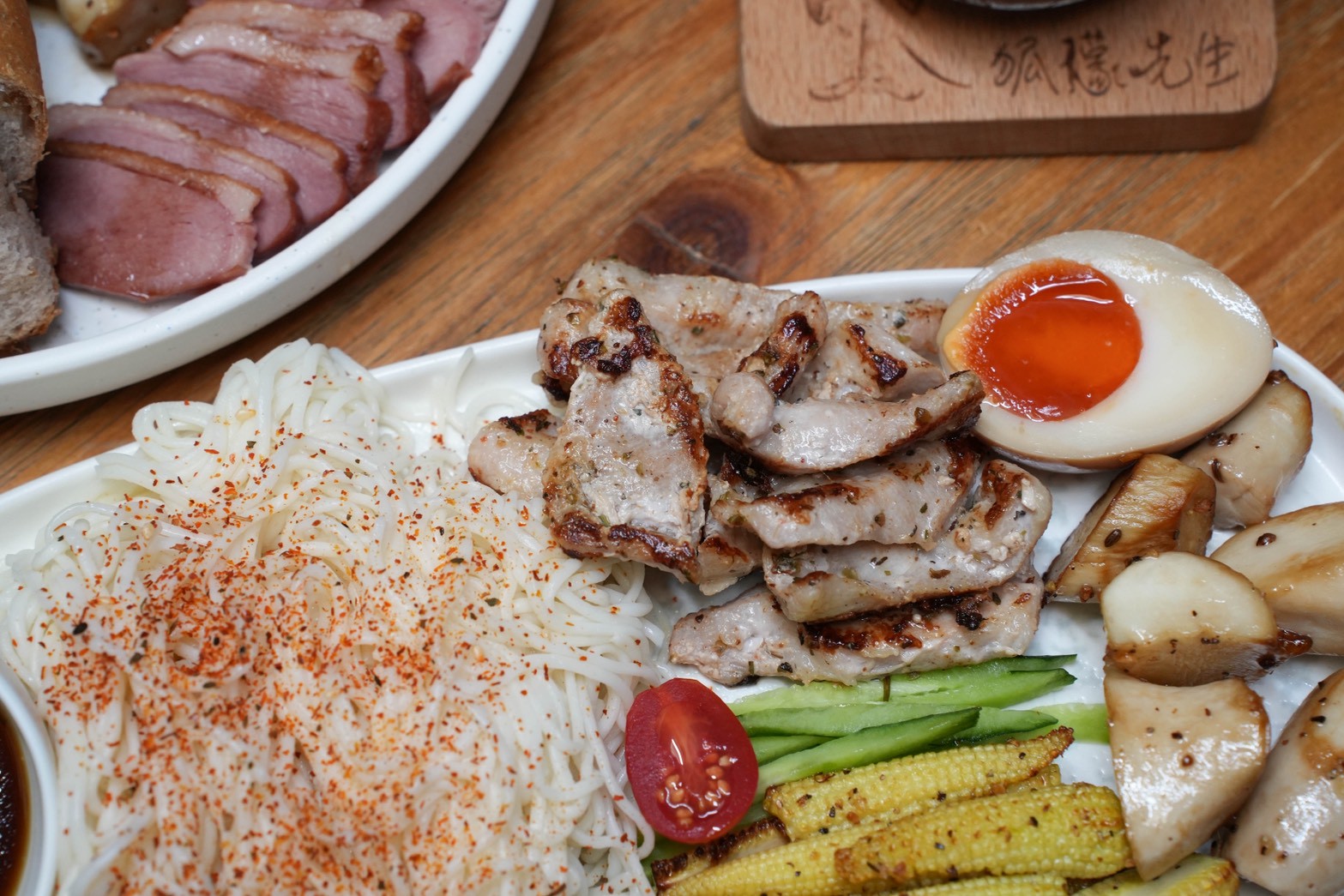 香煎松阪豬吃起來彈牙、有嚼勁,配菜有玉米筍、溏心蛋、杏鮑菇,都是我自己很喜歡的組合!整體吃起來清爽又有層次,夏天吃很剛好,而且冷麵還可以續加,真的很佛心!