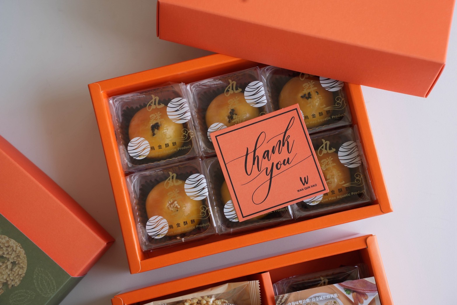 禮盒主色調是亮眼的橘色,視覺上很有中秋節慶氛圍。上層整齊排放著六顆金黃誘人的烏金酥,外層透明包裝可以清楚看到圓潤的酥皮,上面還印有品牌設計。盒中放了一張「thank you」小卡片,很適合送禮