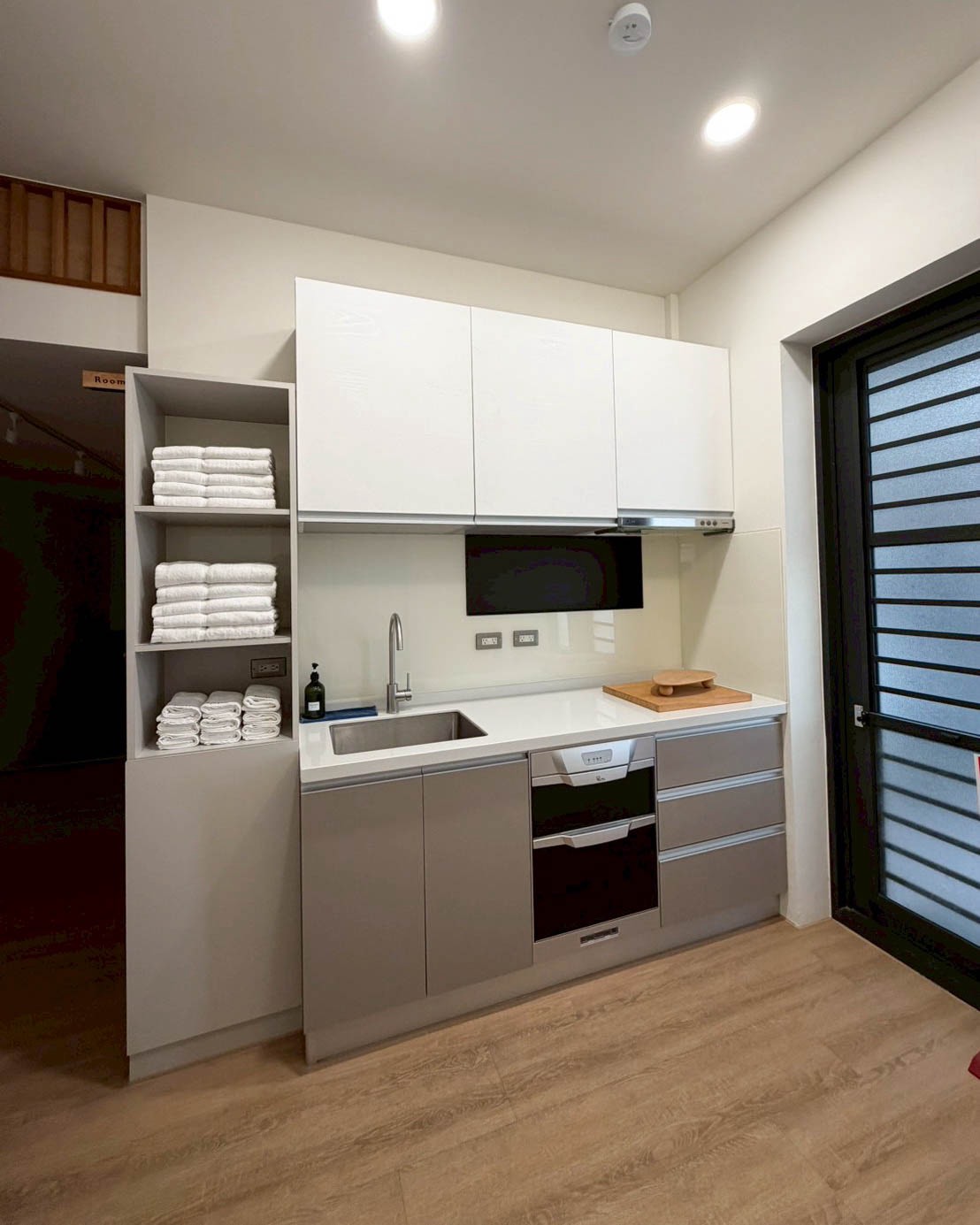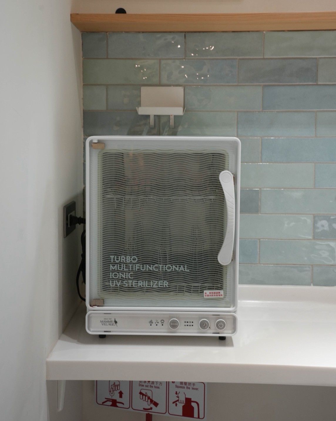 廚房裡有飲水機跟消毒鍋,帶小小孩一起出來玩真的會鬆一口氣,不用自己帶大台的消毒器,也不用煩惱熱水哪裡來,東西洗一洗放進去就好,對爸媽超友善。