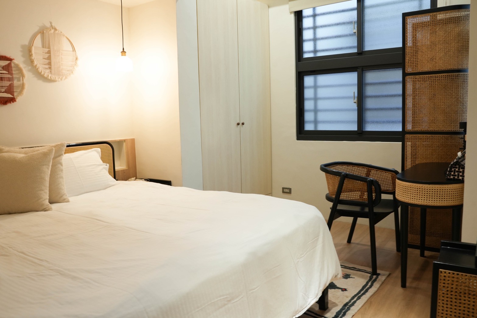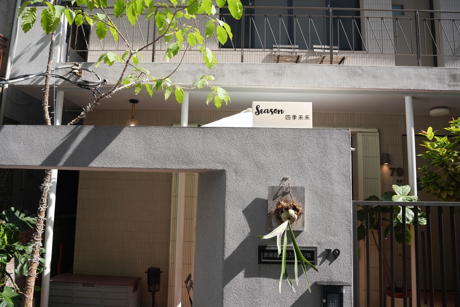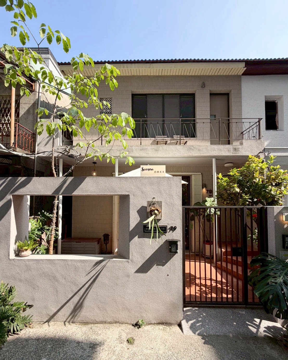 隱身在巷弄裡、外觀清新低調,整體是溫柔的灰白色調,帶點日系簡約風,門口有陽光灑落、植物綠意陪襯,看起來安靜又很有生活感。一走近就能感受到那種「藏在城市裡的小小度假基地」的氛圍。民宿有配合的停車場,走路約2~3分鐘,入住可以免費停一台車