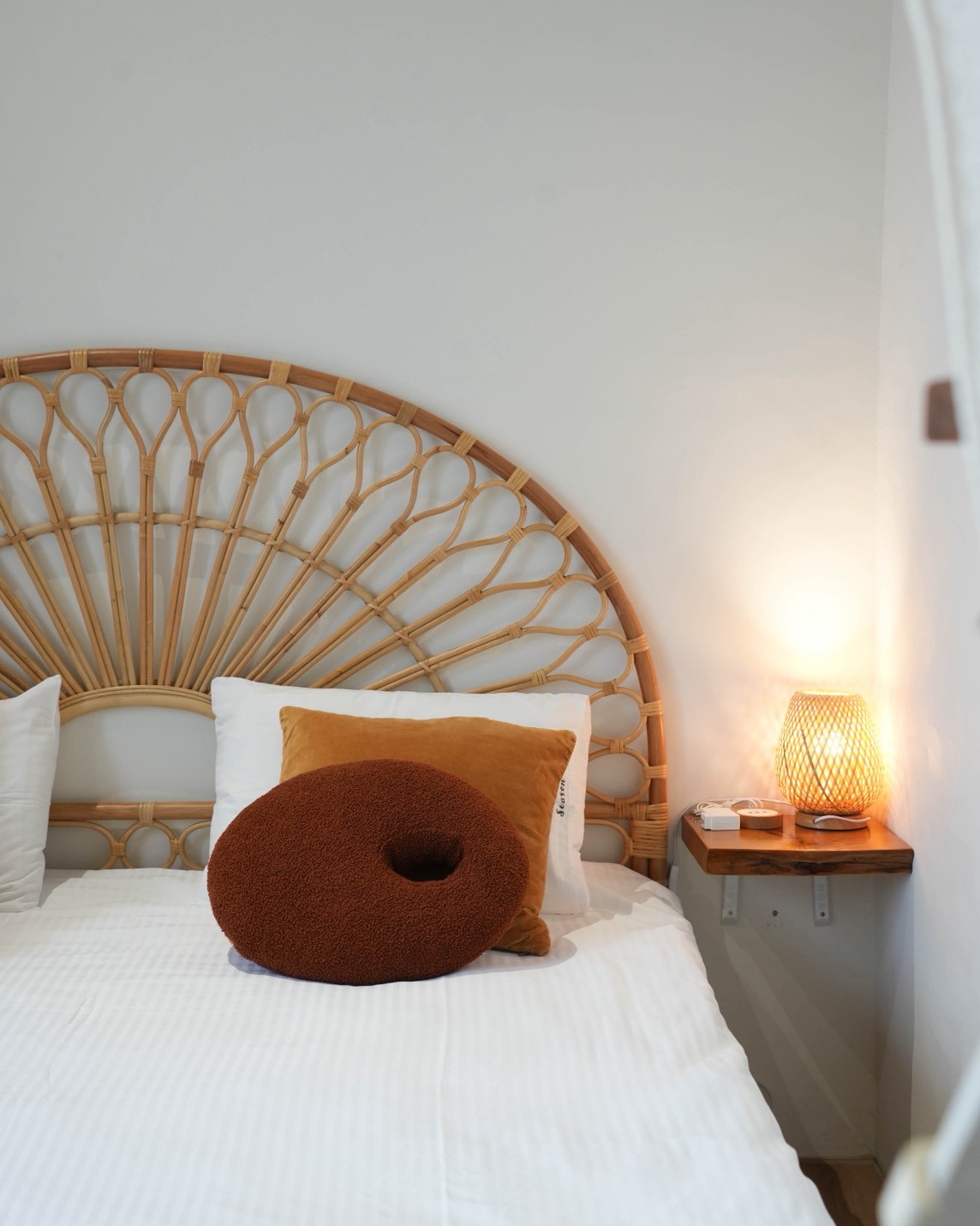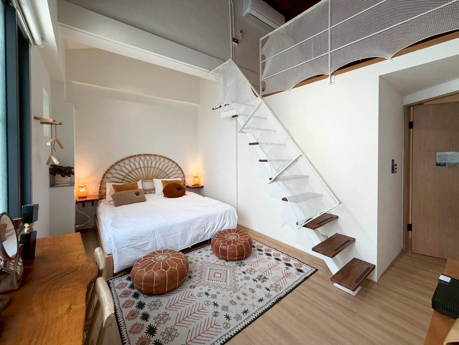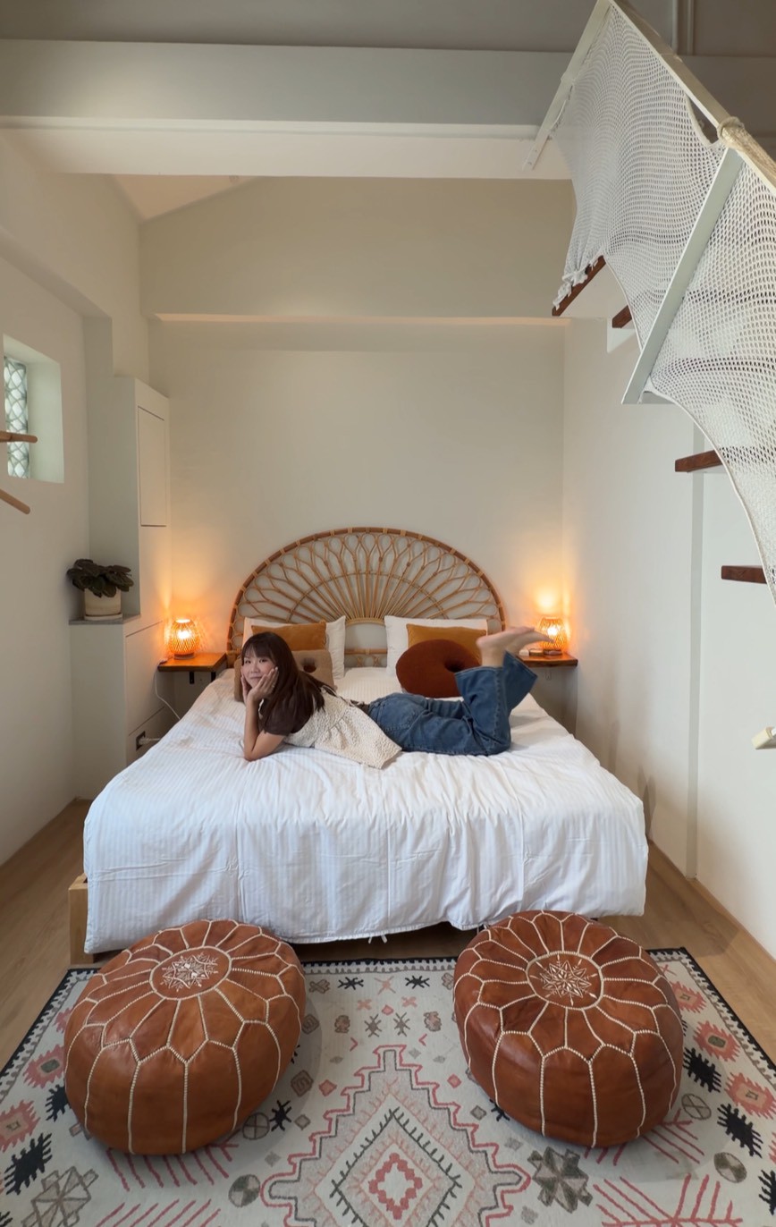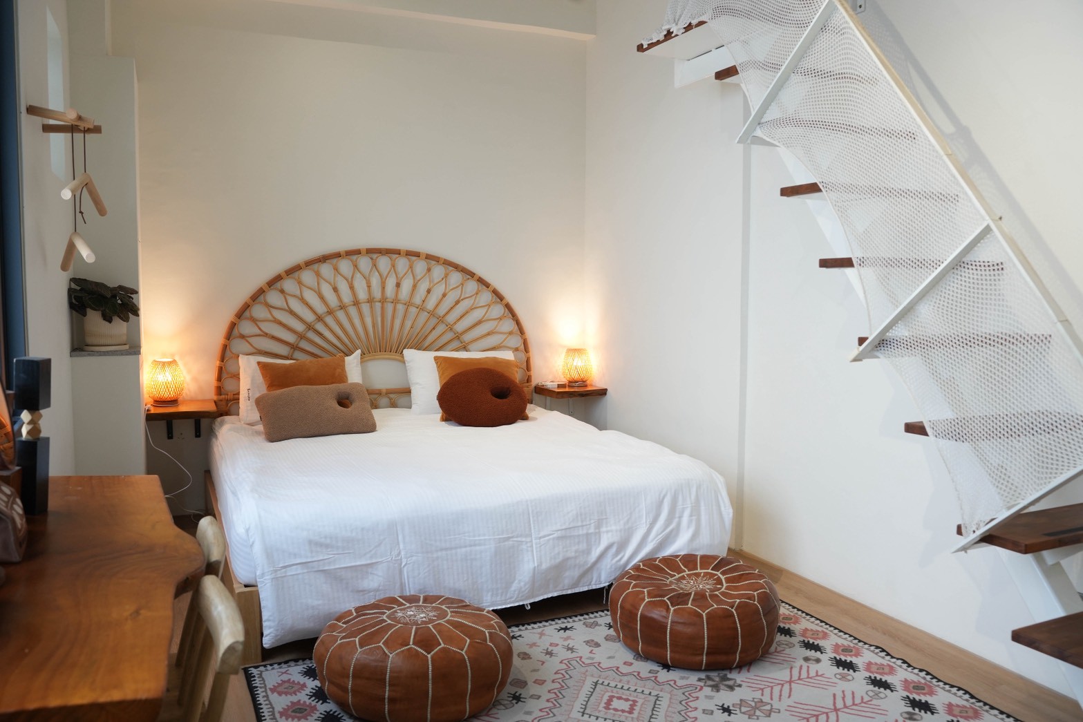 房間以暖色系為主調,窗邊採光很好自然光灑滿整個空間,下層放著一張大床,搭配藤編床頭與柔和燈光,氛圍超放鬆。地上鋪著帶圖騰的地毯,配上坐墊很適合朋友們一起坐著聊天~一旁的白色樓梯通往上層的空間,整體風格簡約又溫暖~