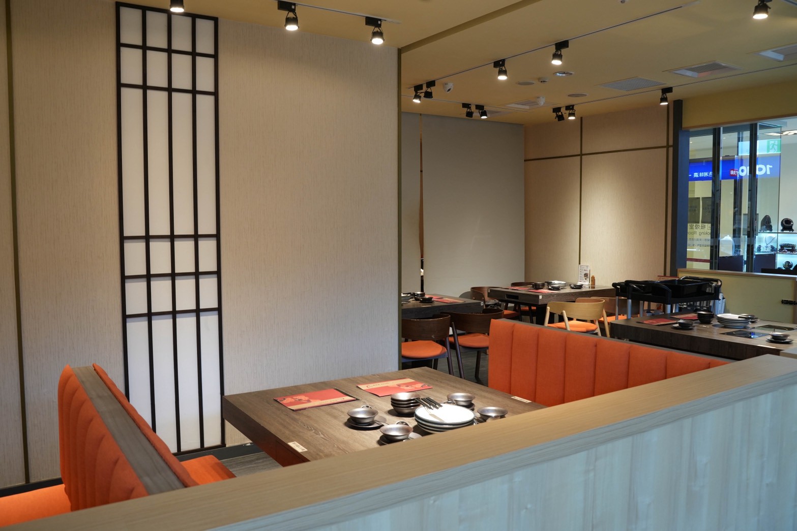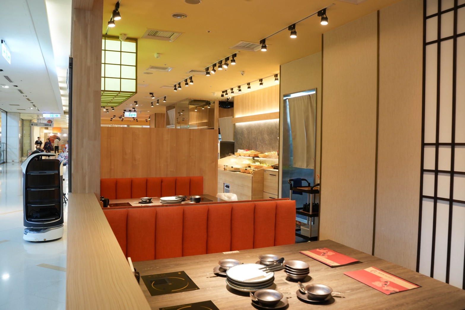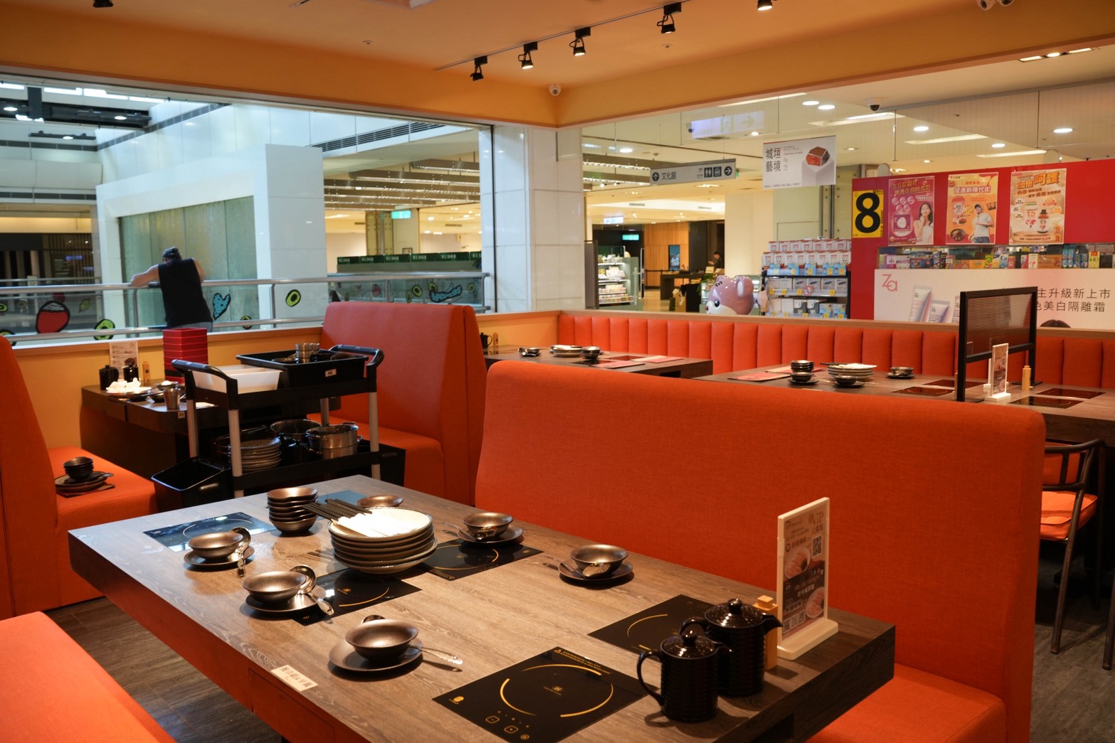 店內採用橘紅色沙發座椅,搭配木質桌面,整齊擺放著個人電磁爐與鍋具、碗盤、沾醬壺,一切準備就緒,感覺非常乾淨俐落。整體空間寬敞不擁擠,座位之間的距離剛好,很適合家庭聚餐。百貨公司裡的環境又有冷氣、動線順暢,對親子客或喜歡舒適吃鍋的人來說相當友善。