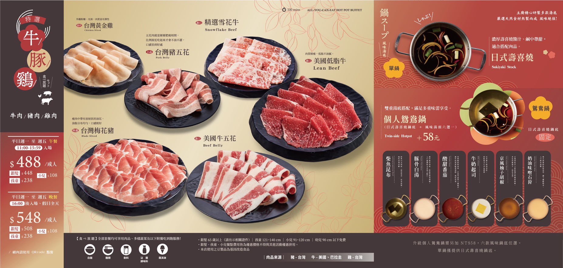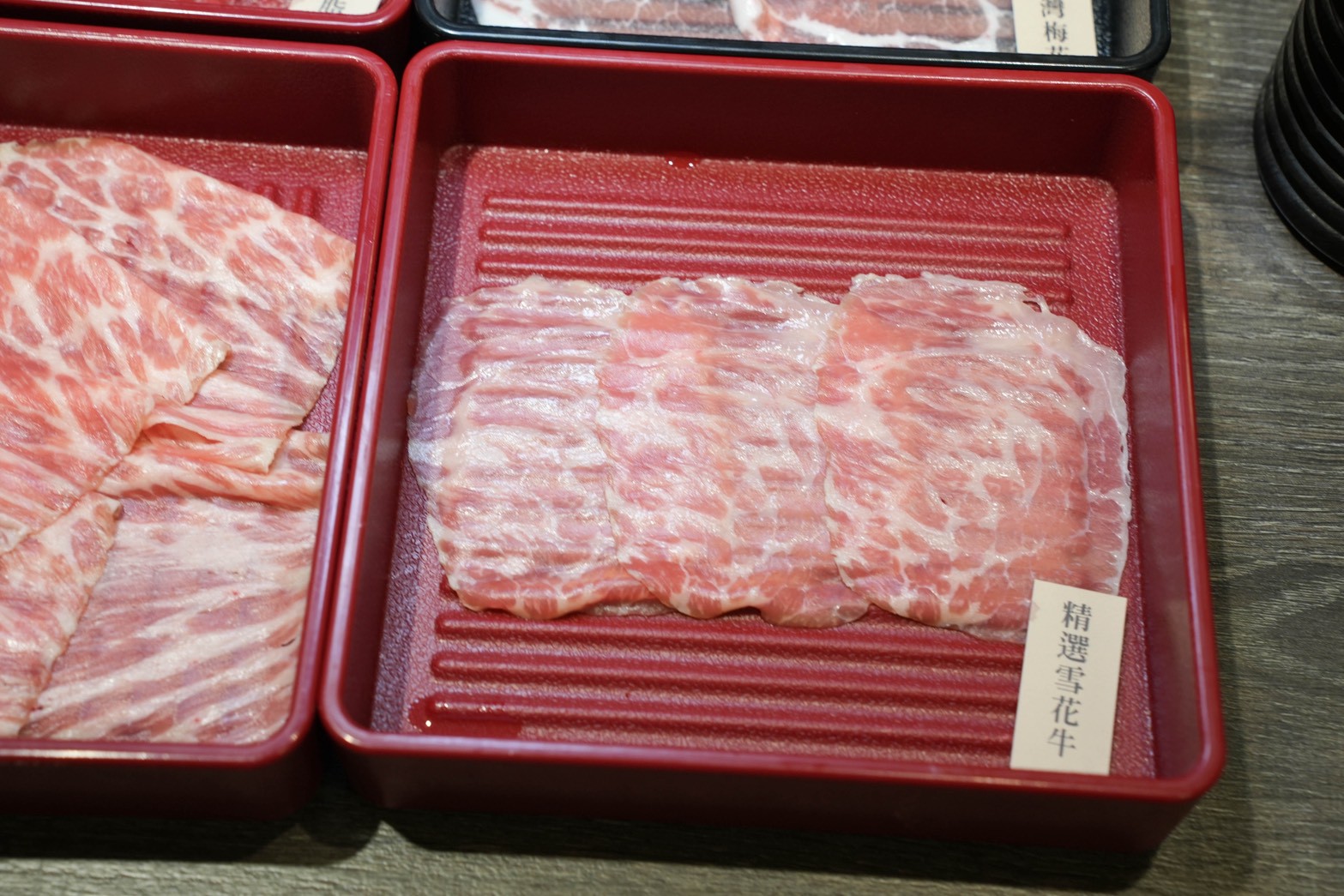 牛豬雞肉品選擇多通通吃到飽,有精選雪花牛、美國低脂牛、美國牛五花、台灣梅花豬、台灣豬五花、台灣黃金雞