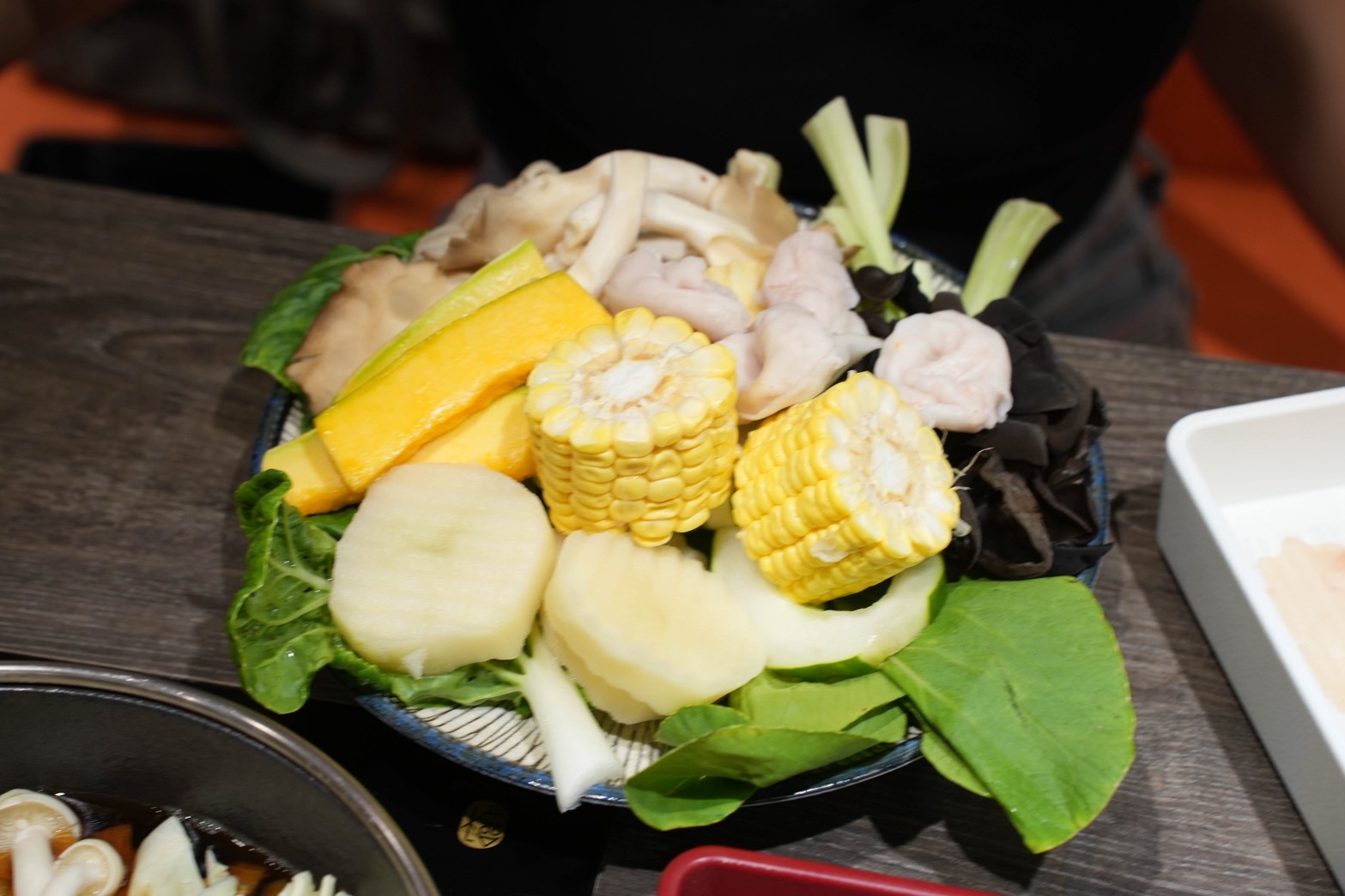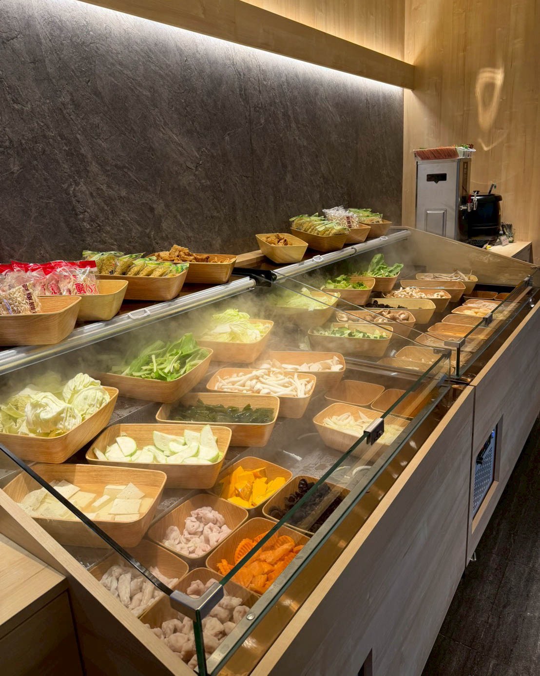 各種蔬菜、菇類、豆腐、火鍋料應有盡有,像是高麗菜、青江菜、金針菇、豆皮、南瓜、玉米筍、豆腐、海帶芽等通通都有,還能看到上層擺著幾款麵食,選擇超多~~~