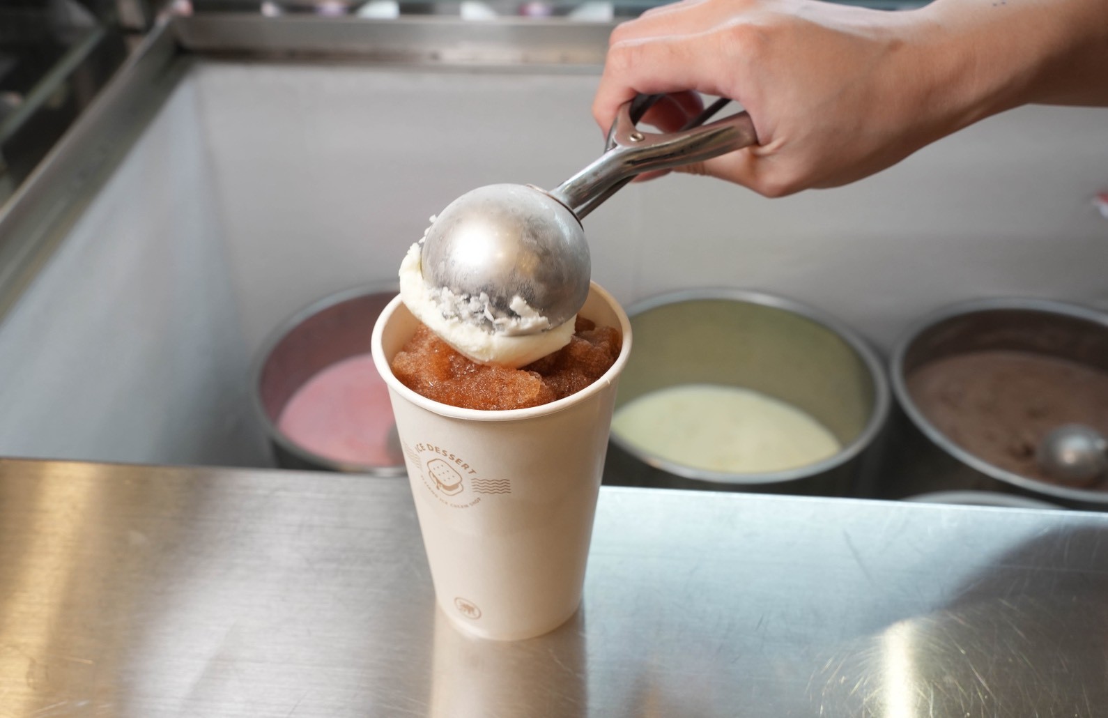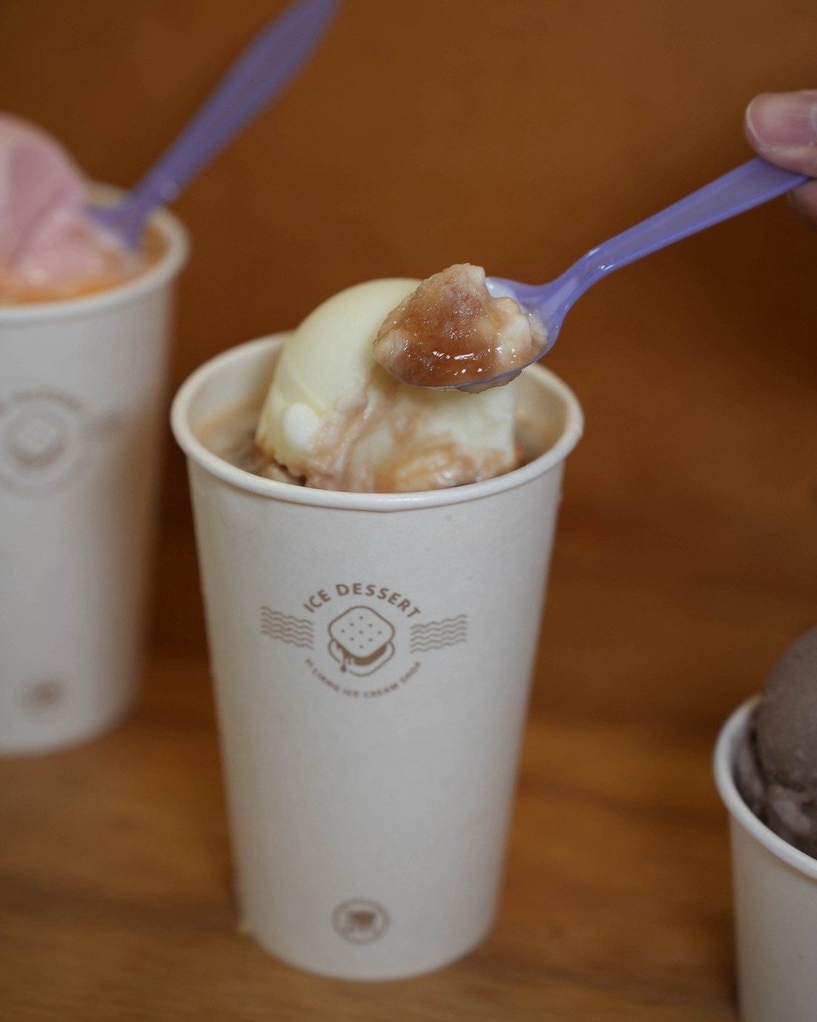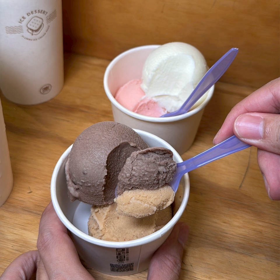 如果想單純吃冰淇淋,也可以點雙球的組合,冰淇淋口味有牛奶、花生、抹茶、可可、草莓。牛奶口感很純,吃得出來是真材實料,不會太甜,花生口味也是我的愛,吃起來十分濃郁