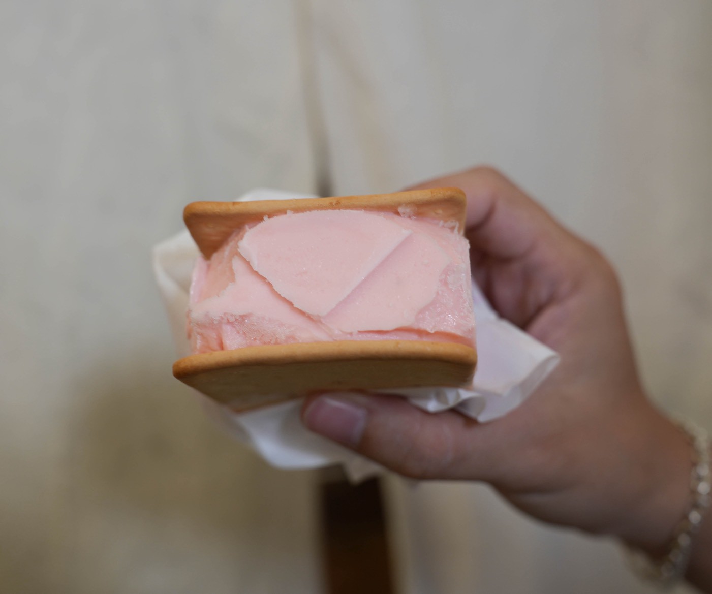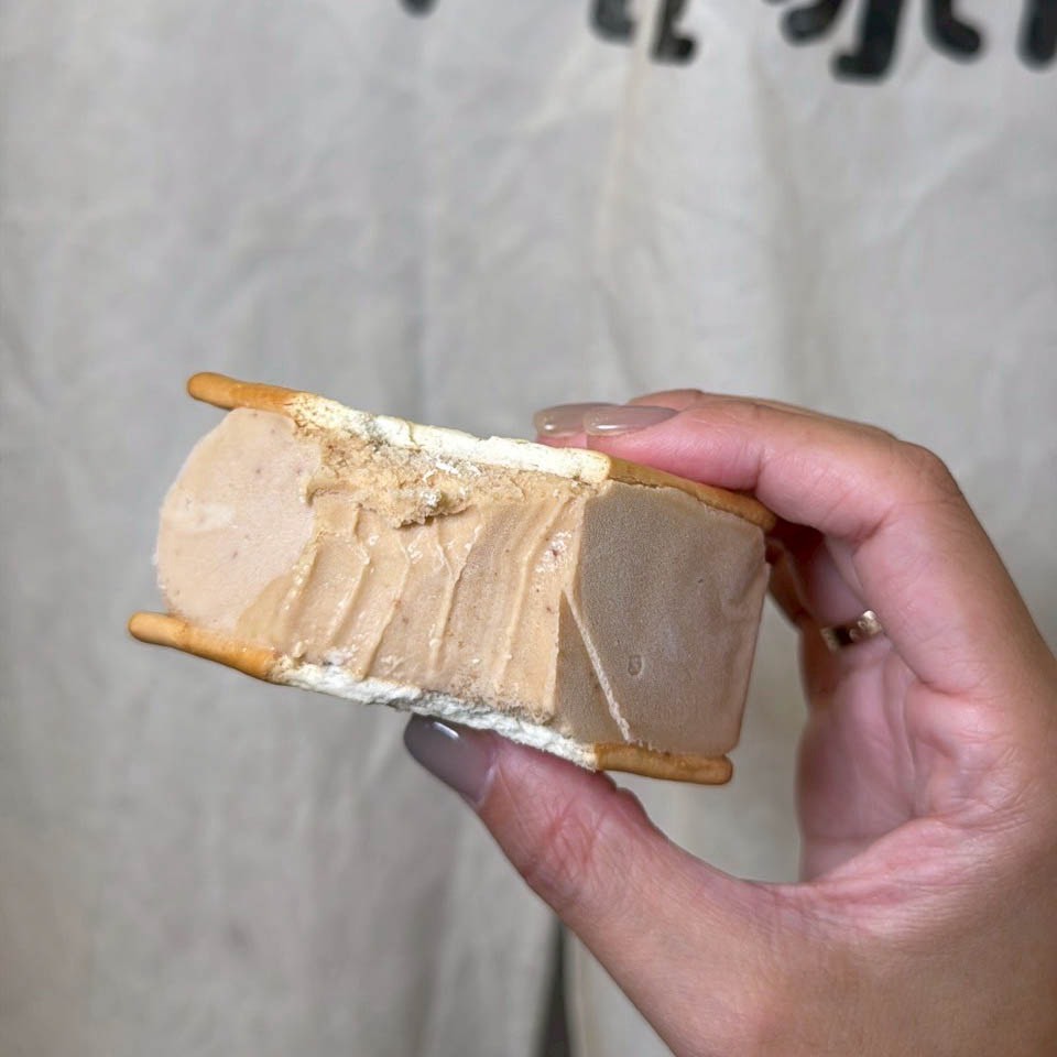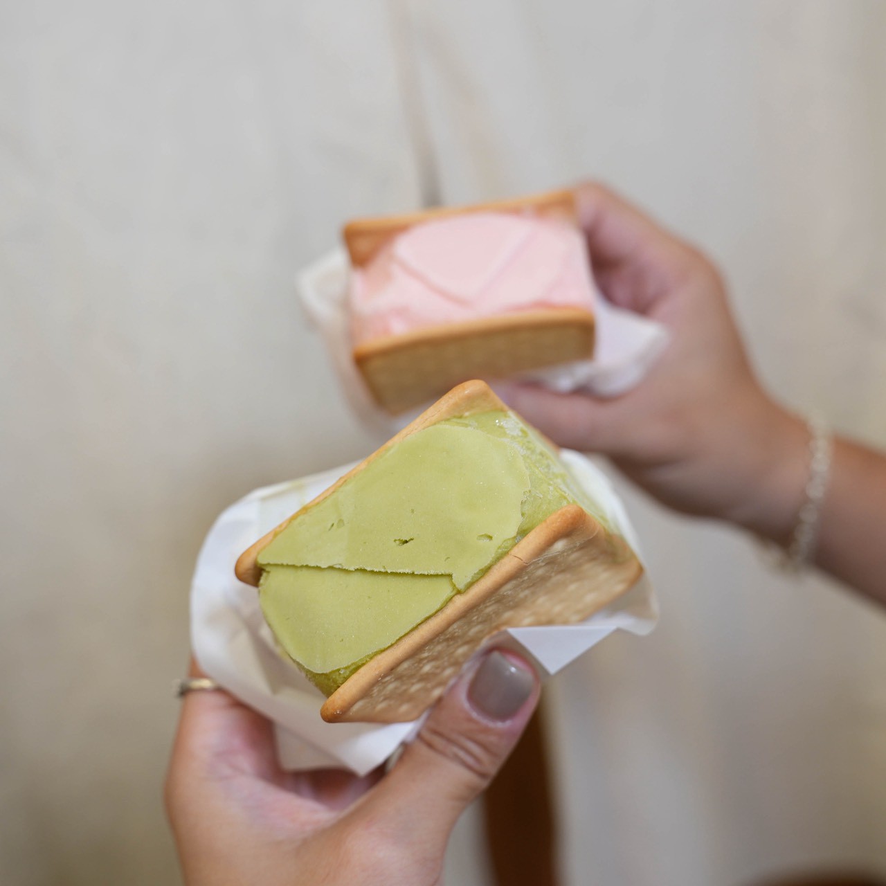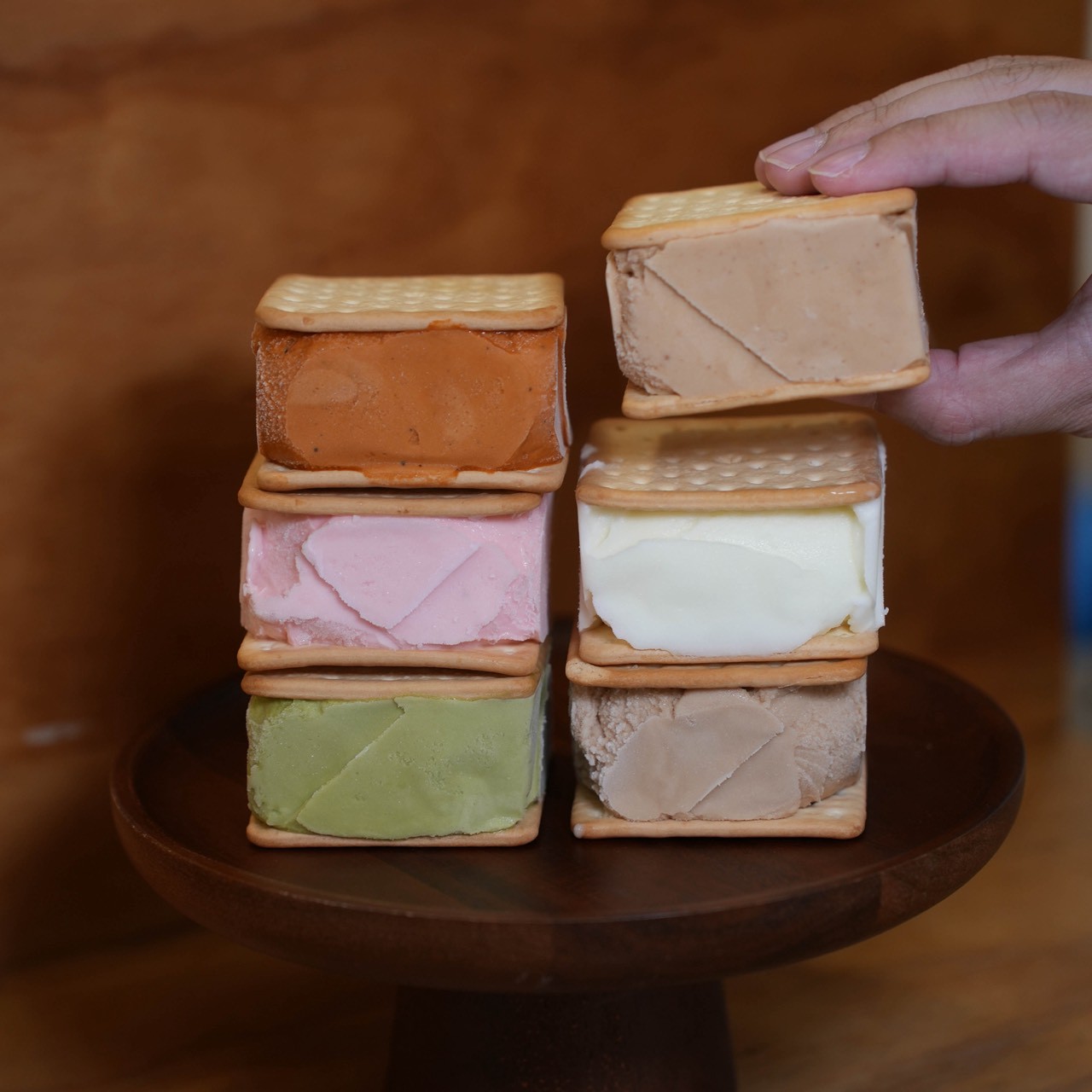 冰餅用的是嘉義名產福義軒蘇打餅,餅乾酥脆不容易軟掉,咬下去還會有卡滋聲。中間夾著超厚實的冰淇淋,冰冰涼涼又很爽口。